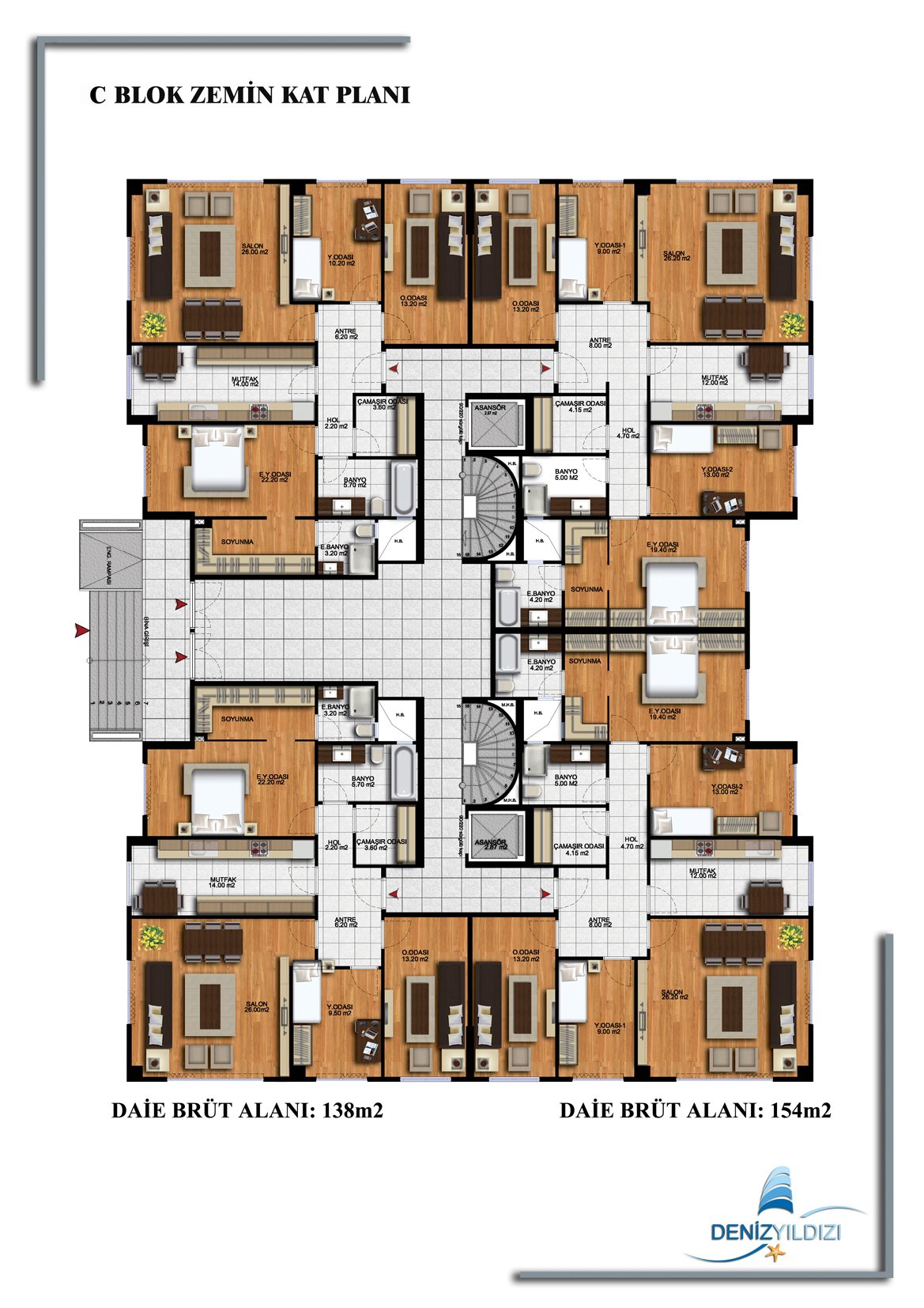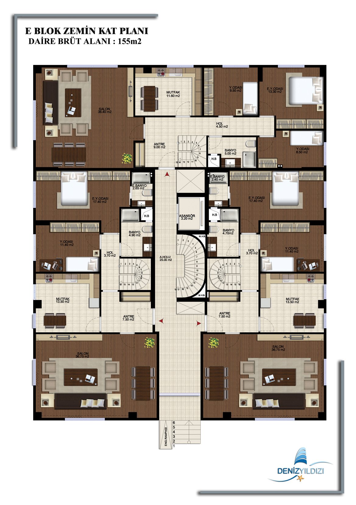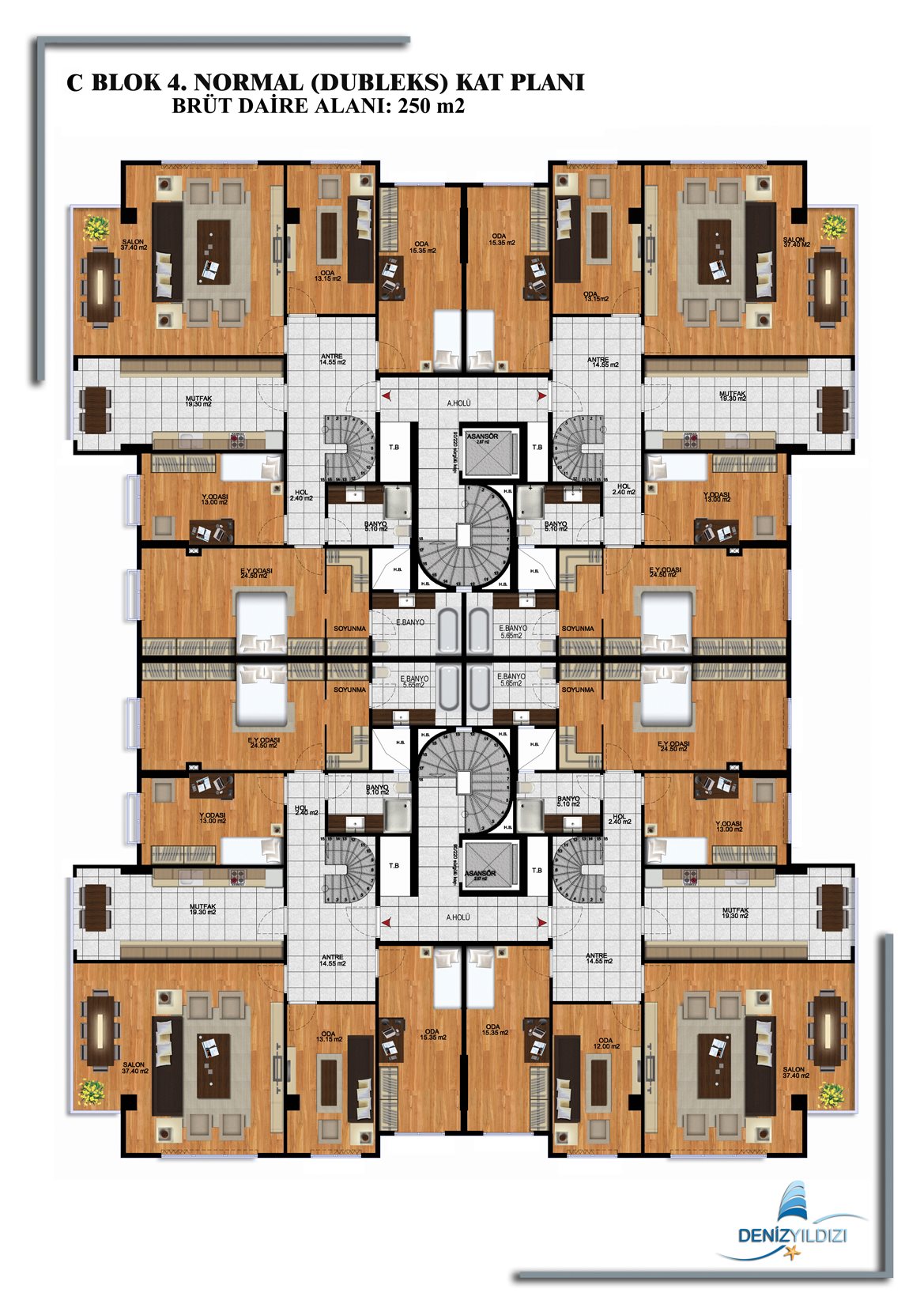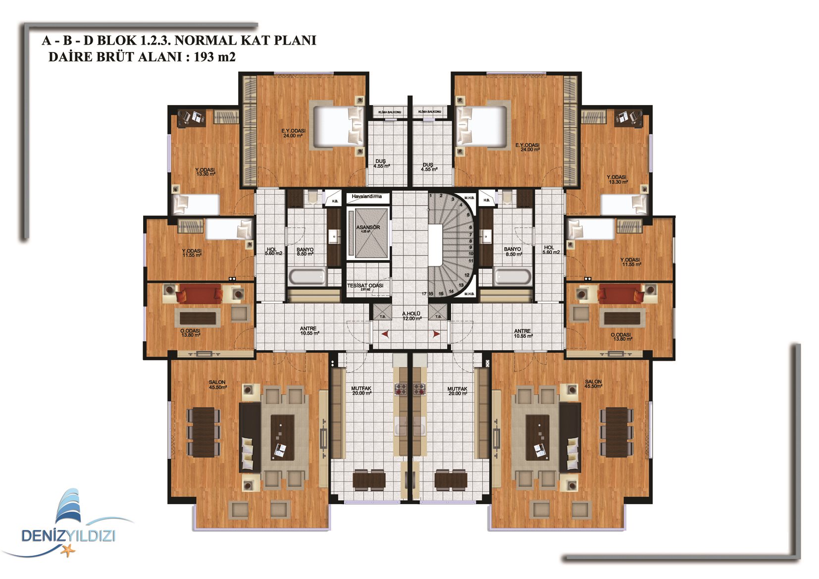 Çolakoğlu Deniz Yıldızı projesinde 3 oda 1 salon daireler 138 ila 155 metrekare, 4 oda 1 salon daireler 154 ila 193 metrekare ve 6 oda 2 salon daireler 250 ila 300 metrekare büyüklüklerle dizayn edildi.