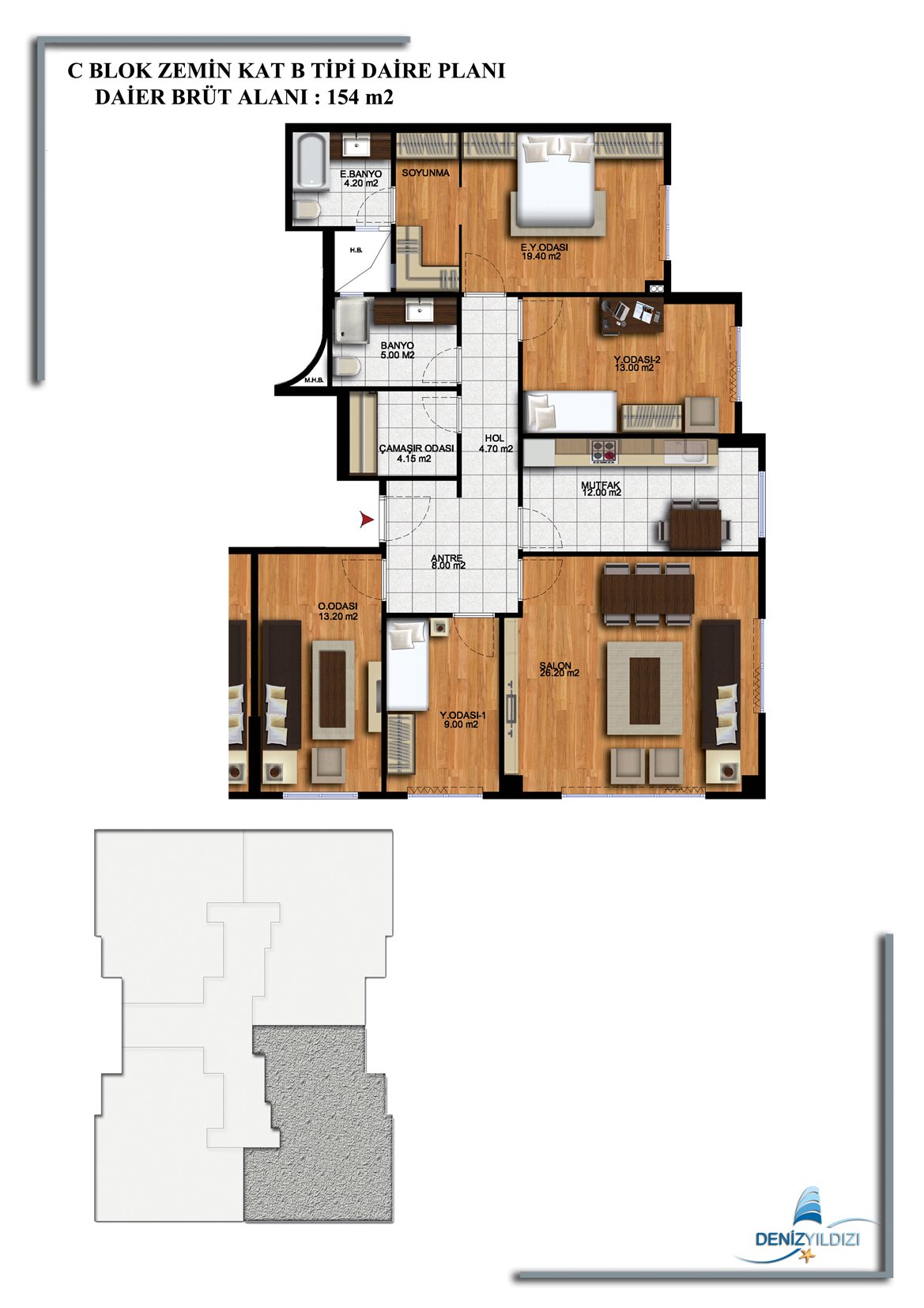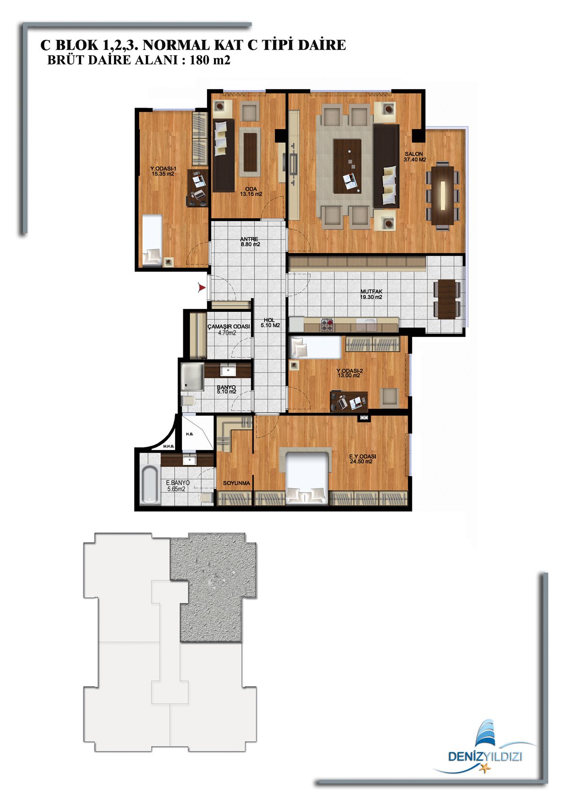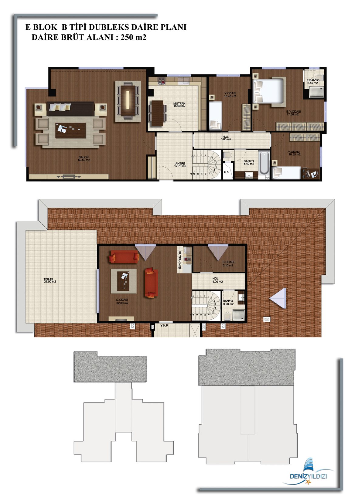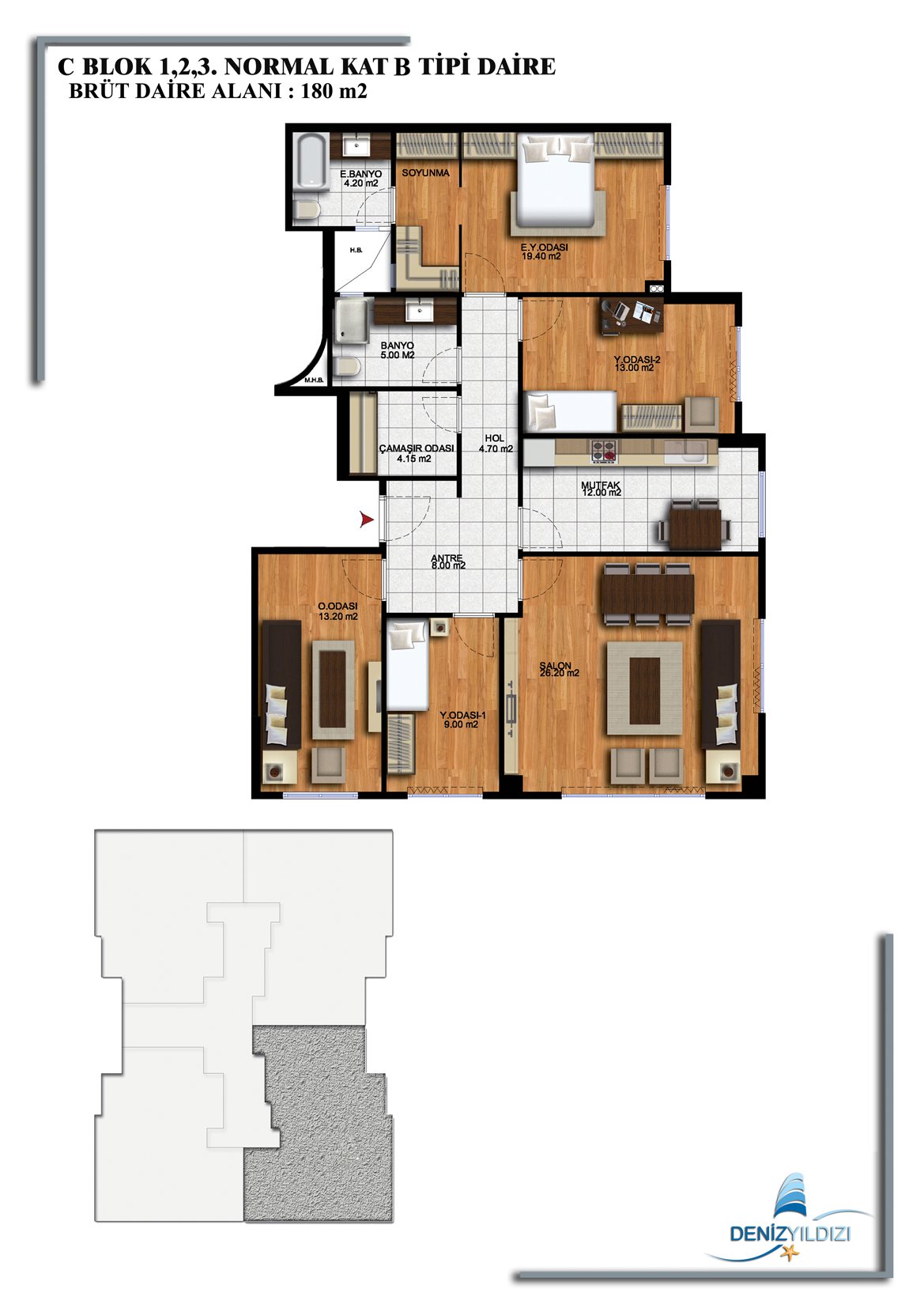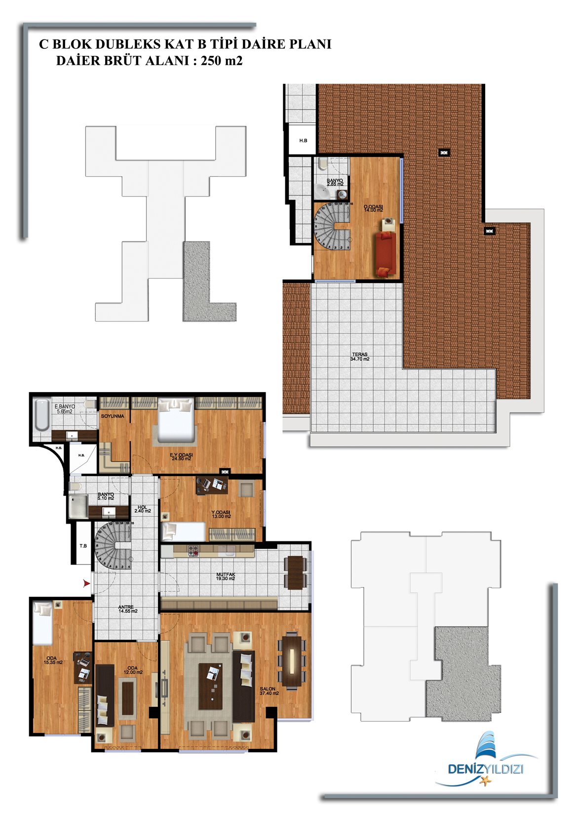 Çolakoğlu Deniz Yıldızı projesinde 3 oda 1 salon daireler 138 ila 155 metrekare, 4 oda 1 salon daireler 154 ila 193 metrekare ve 6 oda 2 salon daireler 250 ila 300 metrekare büyüklüklerle dizayn edildi.