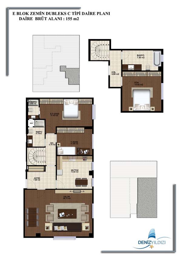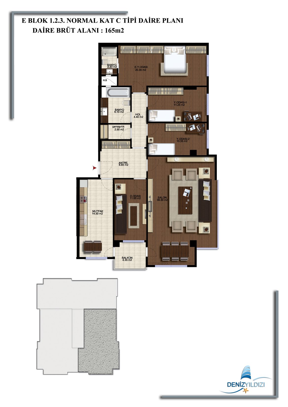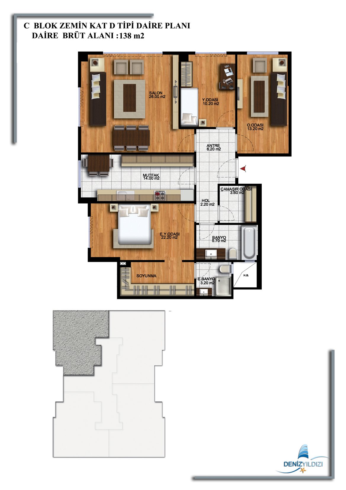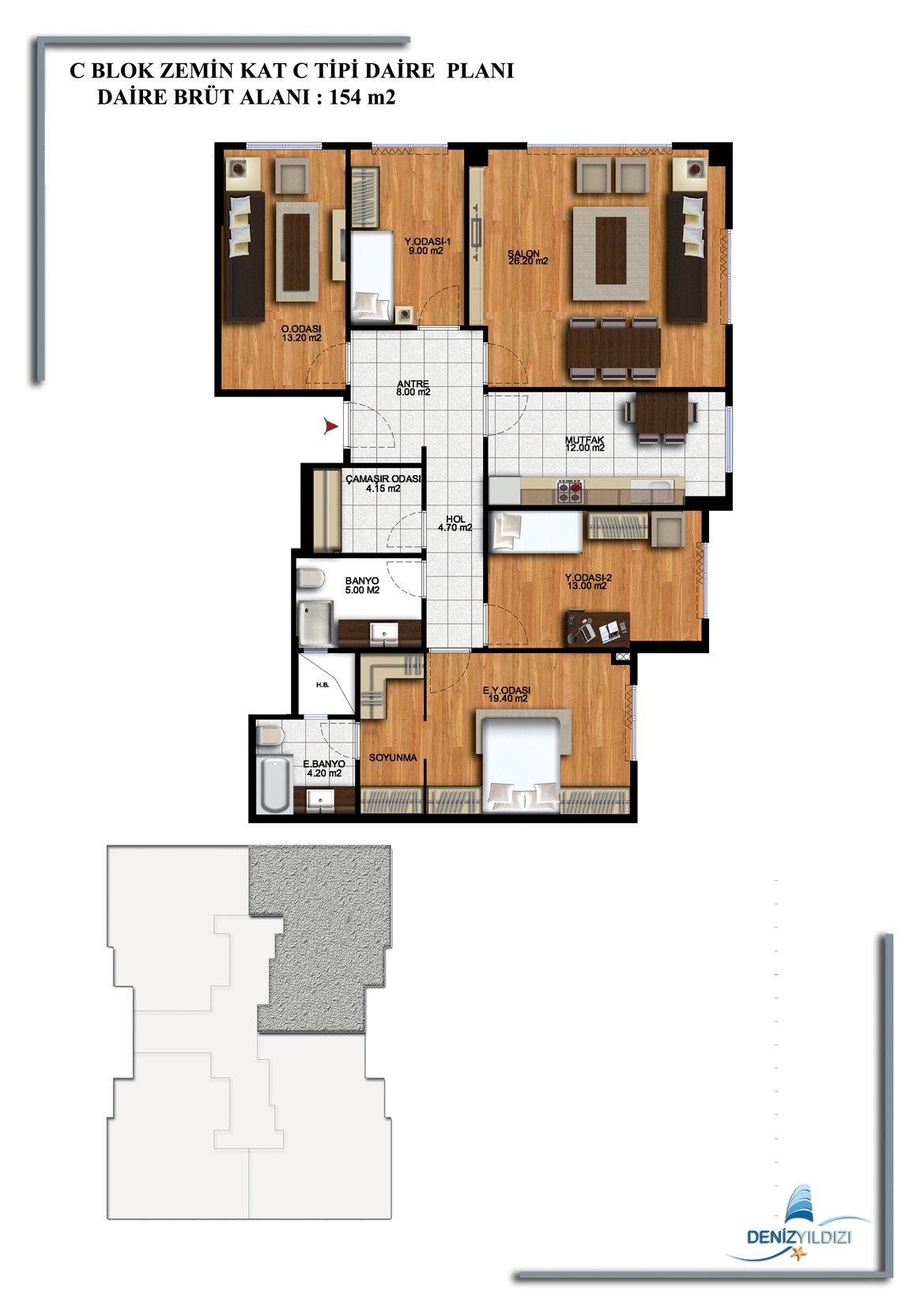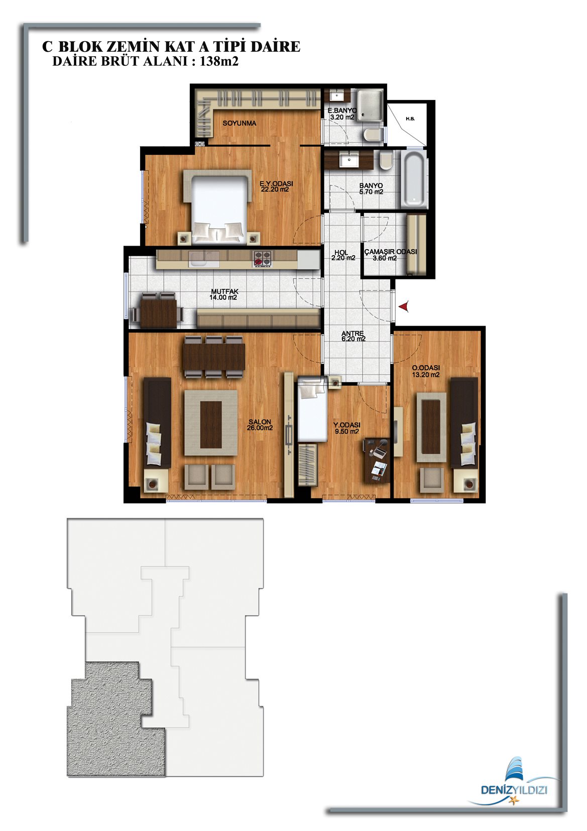 Çolakoğlu Deniz Yıldızı projesinde 3 oda 1 salon daireler 138 ila 155 metrekare, 4 oda 1 salon daireler 154 ila 193 metrekare ve 6 oda 2 salon daireler 250 ila 300 metrekare büyüklüklerle dizayn edildi.