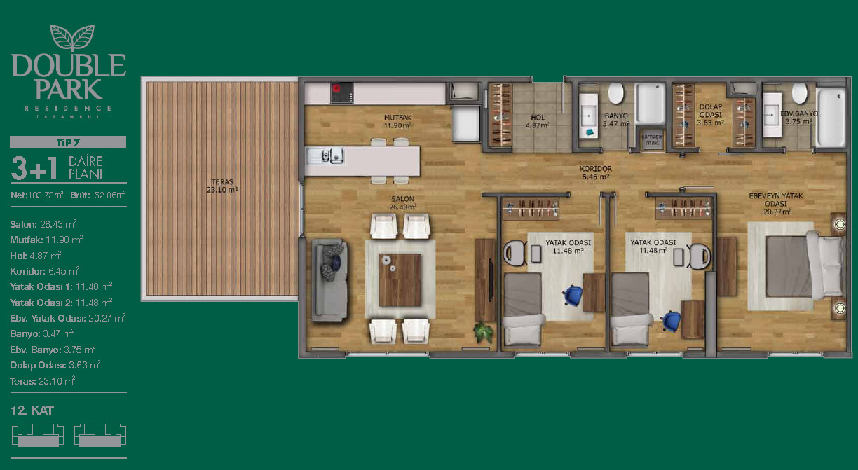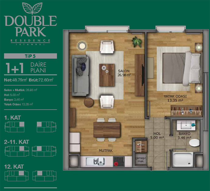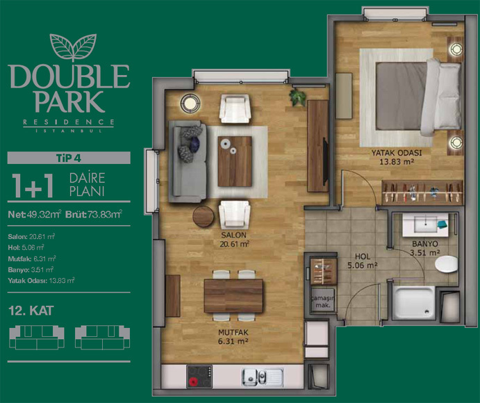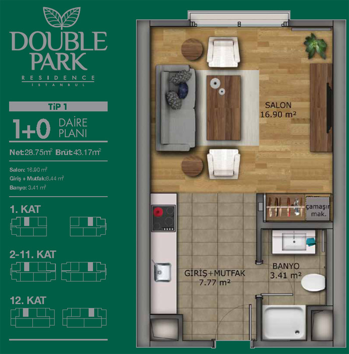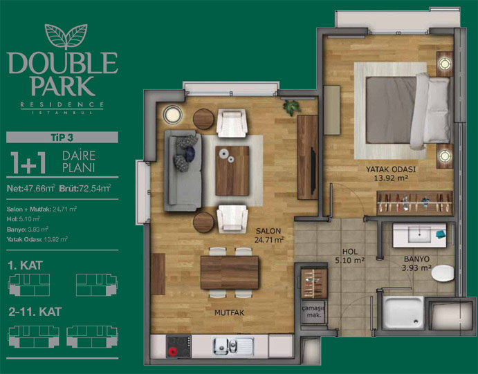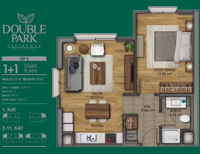 Yaşamın başladığı Double Park Residence projesinde 1+0 daireler 42, 43 metrekare, 1+1 daireler 66 ila 74 metrekare, 2+1 daireler 110 ila 116 metrekare, 3+1 daireler ise 152 metrekare alanlarla dizayn edildi.