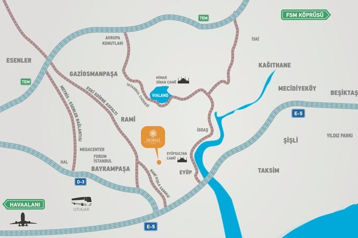 - Oturum amaçlı tercih edilen projeden Taksim, Vialand AVM ve Boğaziçi Köprüsü'ne ulaşmak sadece 20 dakika.