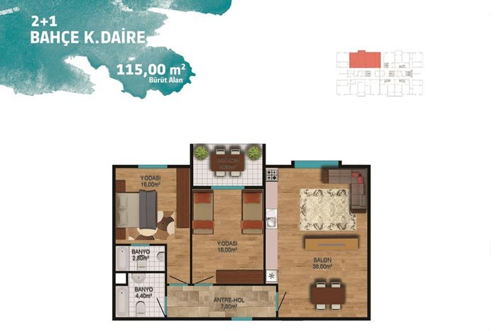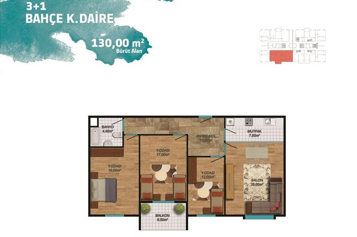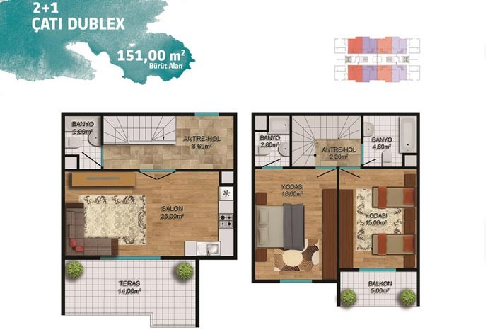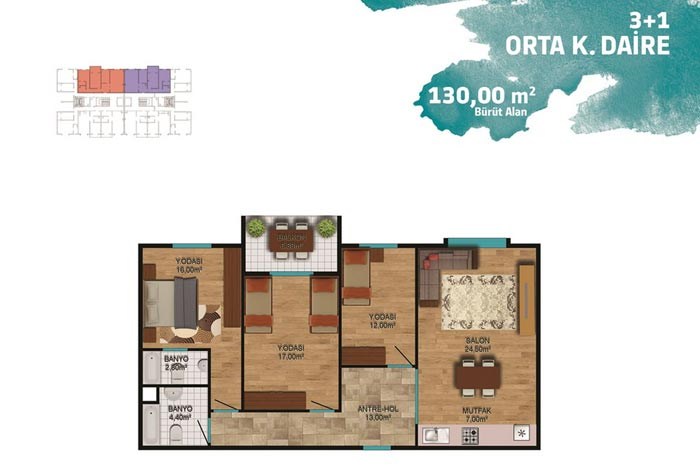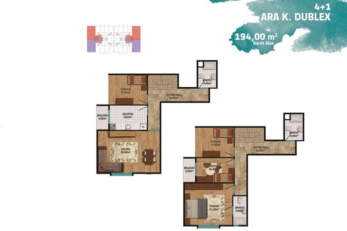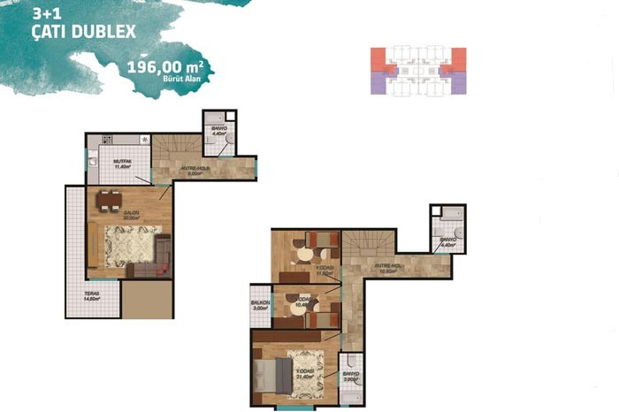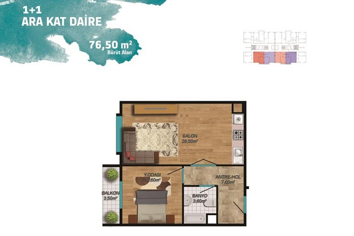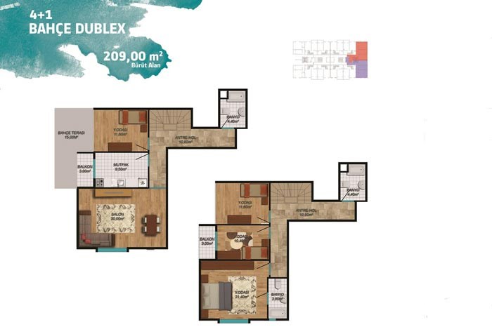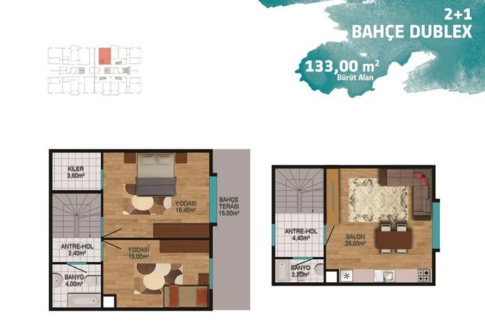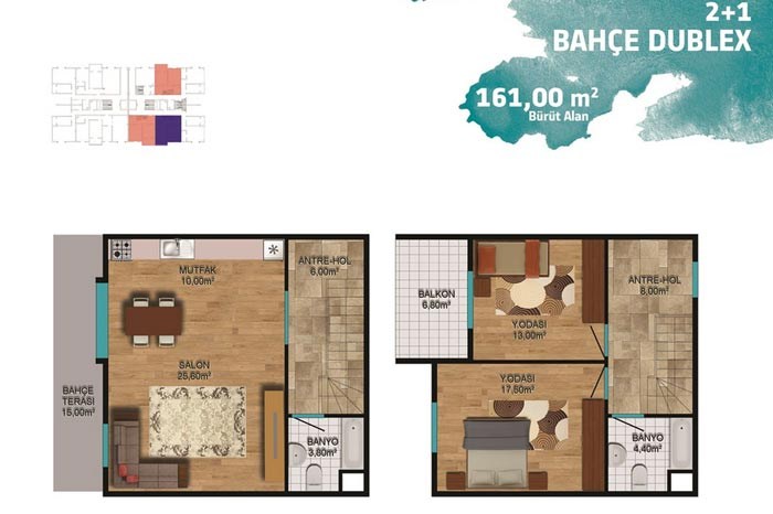 Es'Marin Konakları projesinde 1 oda 1 salon, 2 oda 1 salon, 2 oda 1 salon dubleks, 3 oda 1 salon, 3 oda 1 salon dubleks ve 4 oda 1 salon dubleks daire seçenekleri yer alıyor.