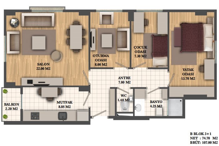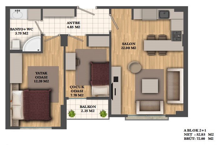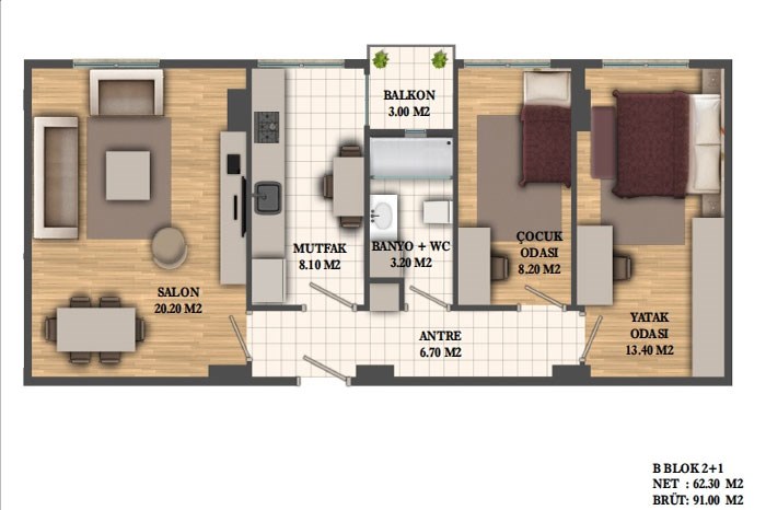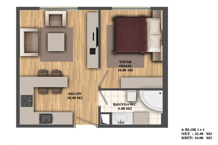 Pendik Essen Park projesi 1+1 daireler brüt 44 net 32,40 metrekare, 2+1 daireler brüt 96, 91, 80 ve 72 metrekare, net 68,30, 62,30, 57,50 ve 52,85 metrekare, 3+1 daireler brüt 108, 107 ve 104 metrekare, net 78,15 74,70 ve 71,50 metrekare alanlara sahip.
