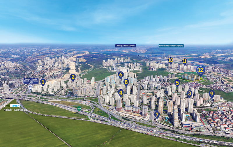 Yüksek yatırım potansiyeli ve aile yaşamına uygun yapısıyla öne çıkan Ispartakule’de konumlanan Bizim Evler 12; geniş peyzaj alanları, ferah konut seçenekleri, tüm ihtiyaçlara yanıt verecek ticari üniteleri, ulaşım avantajları ve eşsiz manzarasıyla dikkat çekiyor. Proje, yapımı hızla devam eden Hasdal - Nakkaş Otoyolu ve TEM Otoyolu Ispartakule gişelerine yalnızca 3 dakika mesafede yer alırken, panoramik Küçükçekmece Gölü manzarasıyla öne çıkıyor. İstanbul Havalimanı ve Yavuz Sultan Selim Köprüsü’ne hızlı ulaşım sağlayan bağlantı yollarının hemen yanı başında bulunan Bizim Evler 12, hem yatırım hem de lokasyon avantajı açısından cazip fırsatlar sunuyor. Türkiye’nin en büyük şehir hastanesi “Çam Sakura” başta olmak üzere Eğitim ve sağlık kurumlarına yakın mesafede konumlanan proje, tüm ihtiyaçlara yanıt verecek ticari üniteleriyle bütüncül bir yaşam alanı sunuyor.
