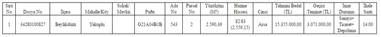 İstanbul Defterdarlığı Avrupa Yakası Milli Emlak Dairesi Başkanlığı, Beylikdüzü Yakuplu mahallesinde yer alan 2 bin 590 metrekarelik arsayı satışa çıkartıyor. Başkanlık arsa için 15 milyon 355 bin TL muhammen bedel belirlemiş durumda.