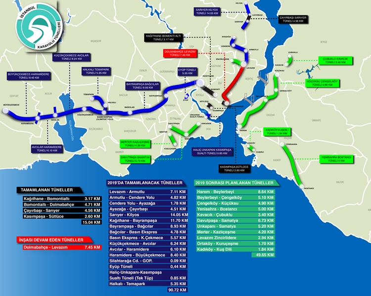 İstanbul Büyükşehir Belediyesi trafiği rahatlatmak amacıyla 16 yeni tünel yol projesine başlıyor. Bu kapsamda Dolmabahçe-Levazım tünel yol projesinin inşaatı devam ederken, 16 tünelin inşaatı başlayacak, 11 tünel yolun ise projelendirme çalışmaları sürüyor.