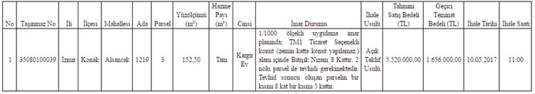 İhale 10 Mayıs Çarşamba günü saat 11:00'da İzmir Defterdarlığı binasının 1. katında bulunan toplantı salonunda gerçekleştirilecek. Başkanlık gayrimenkul için 5 milyon 520 bin TL tahmini bedel belirlemiş durumda.