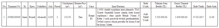 İzmir Defterdarlığı Milli Emlak Daire Başkanlığı, Konka'ta yer alan "kargir ev" nitelikli bir adet taşınmazı satışa çıkartıyor...