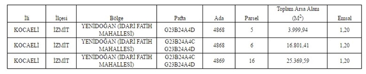Kocaeli İzmit Belediye Başkanlığı, mülkiyeti kendisine ait olan ve Yenidoğan'da yer alan 3 adet arsayı, üzerine kat karşılığı konut, sosyal tesis, ticaret (dükkan), fırın inşa edilmesi için ihaleye çıkartıyor...