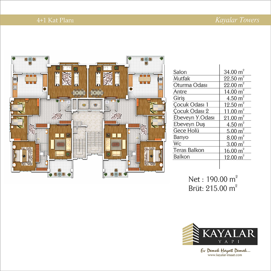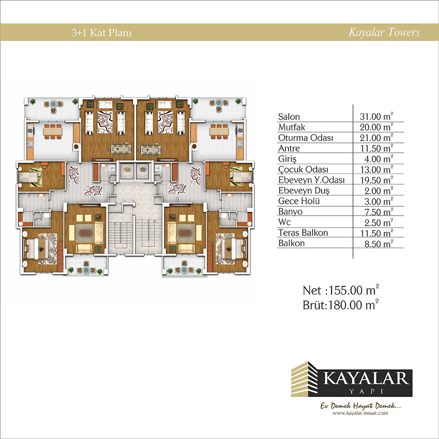 Kayalar Towers projesi 3 oda 1 salon ve 4 oda 1 salon daire tiplerinde dizayn edildi. Projede 3 oda 1 salon daireler 155 metrekare, 4 oda 1 salon daireler ise 190 metrekare büyüklüklere sahip.