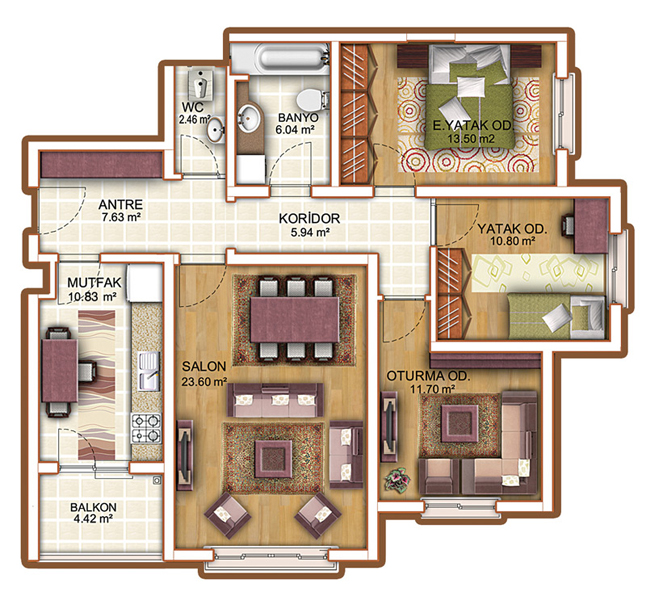 Kiptaş Esenyurt 5. Etap projesinde 75, 95 ve 126 metrekarelik 3 farklı daire tipi bulunuyor.