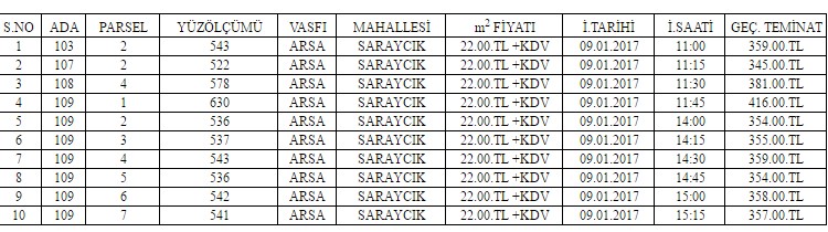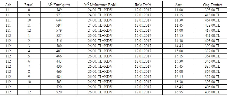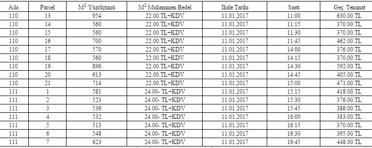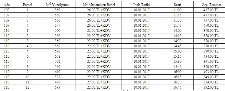 İhaleler 11:00 ile 16:45 saatleri arasında Belediye Encümen Toplantı Salonunda Belediye Encümeni huzurunda gerçekleşecek. İhaleye ait şartname bedeli mukabilinde Tahakkuk Tahsilat Şefliğinden alınabilir.