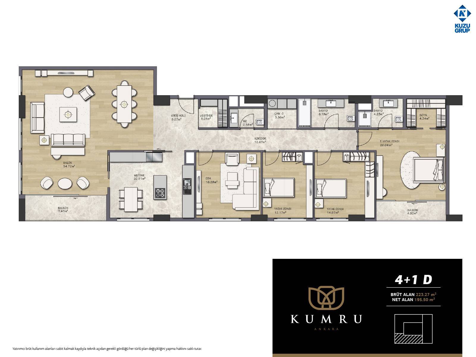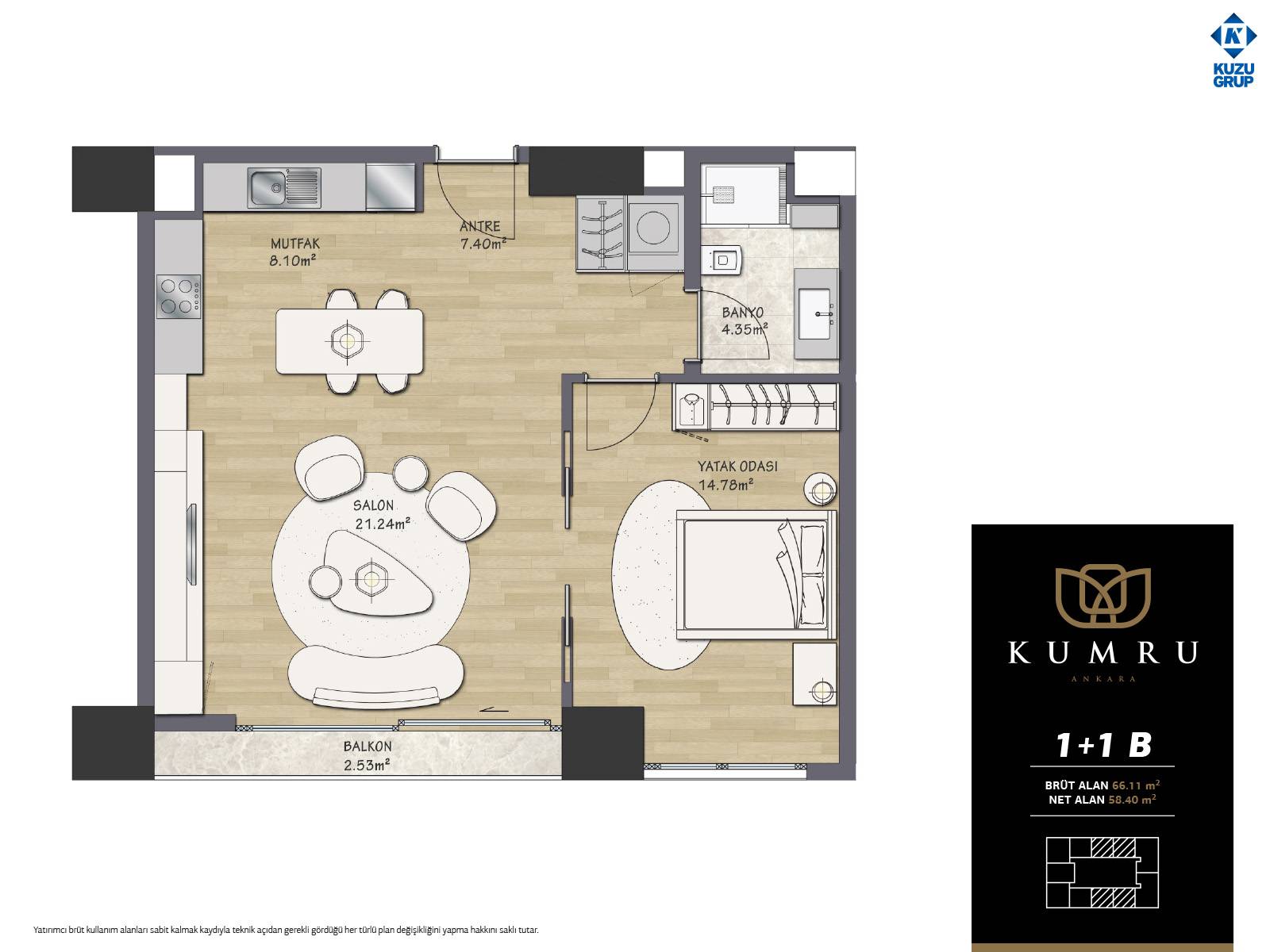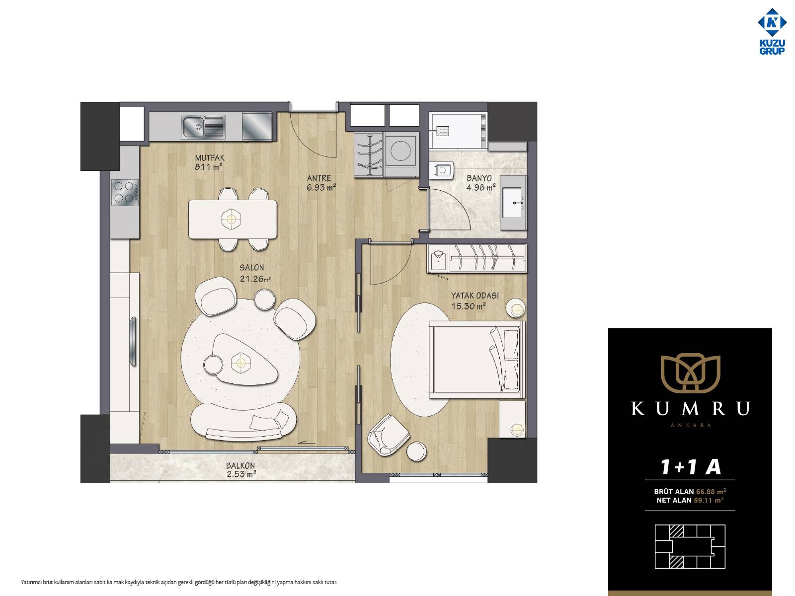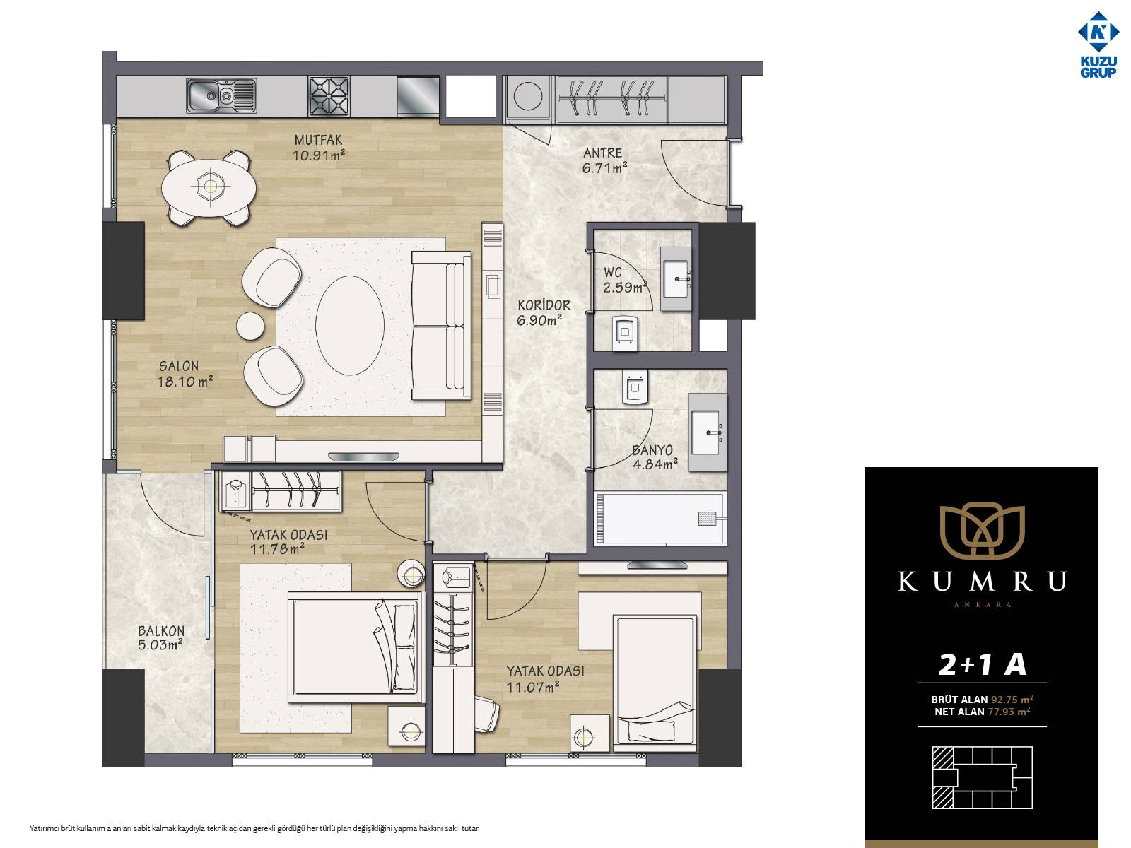 Kumru Ankara'da 1+1 daireler 66.11 ile 82.47 metrekare arasında, 2+1 daireler 92.75 ile 122.06 metrekare arasında, 3+1 daireler 145.62 ile 156.64 metrekare arasında, 4+1 daireler 177.44 ile 223.27 metrekare arasında ve 5+1 daireler 297.10 metrekare büyüklüklere sahip.