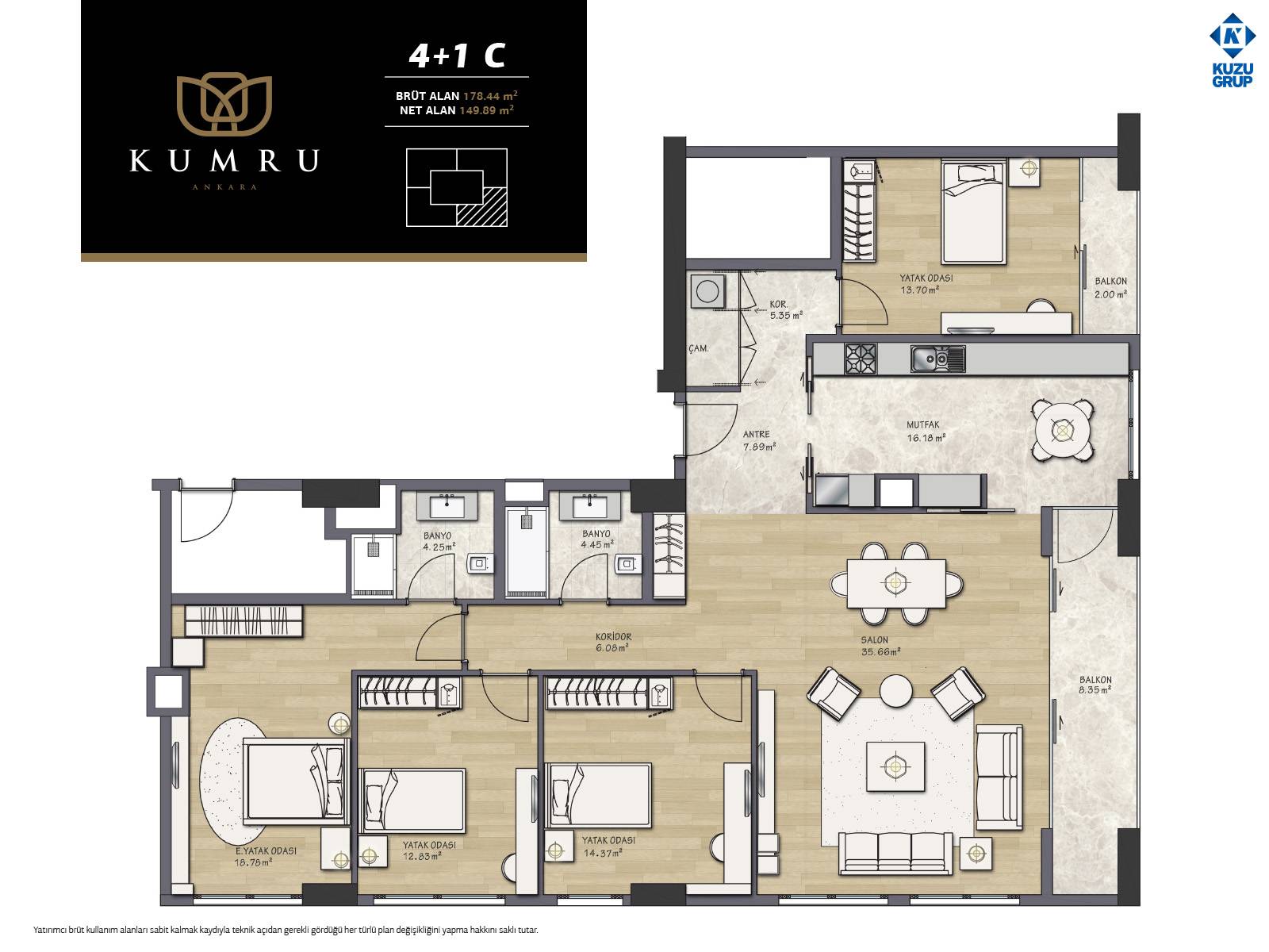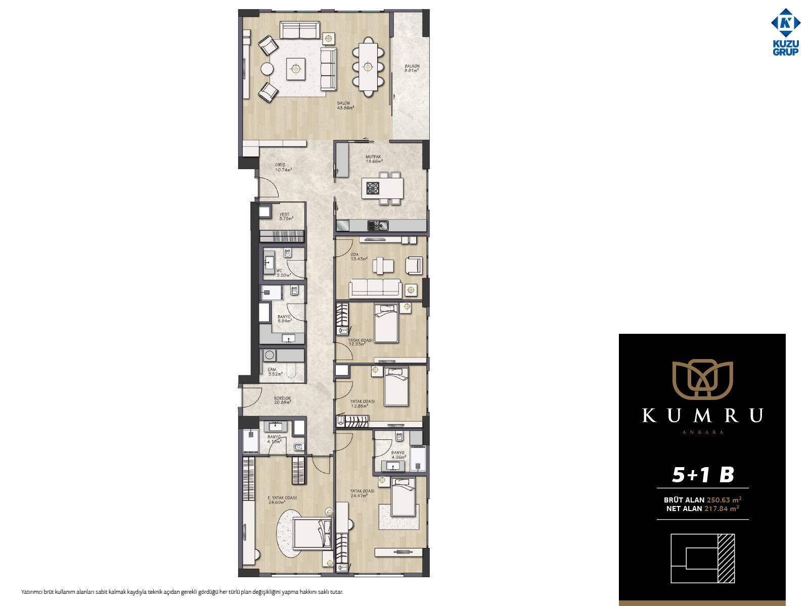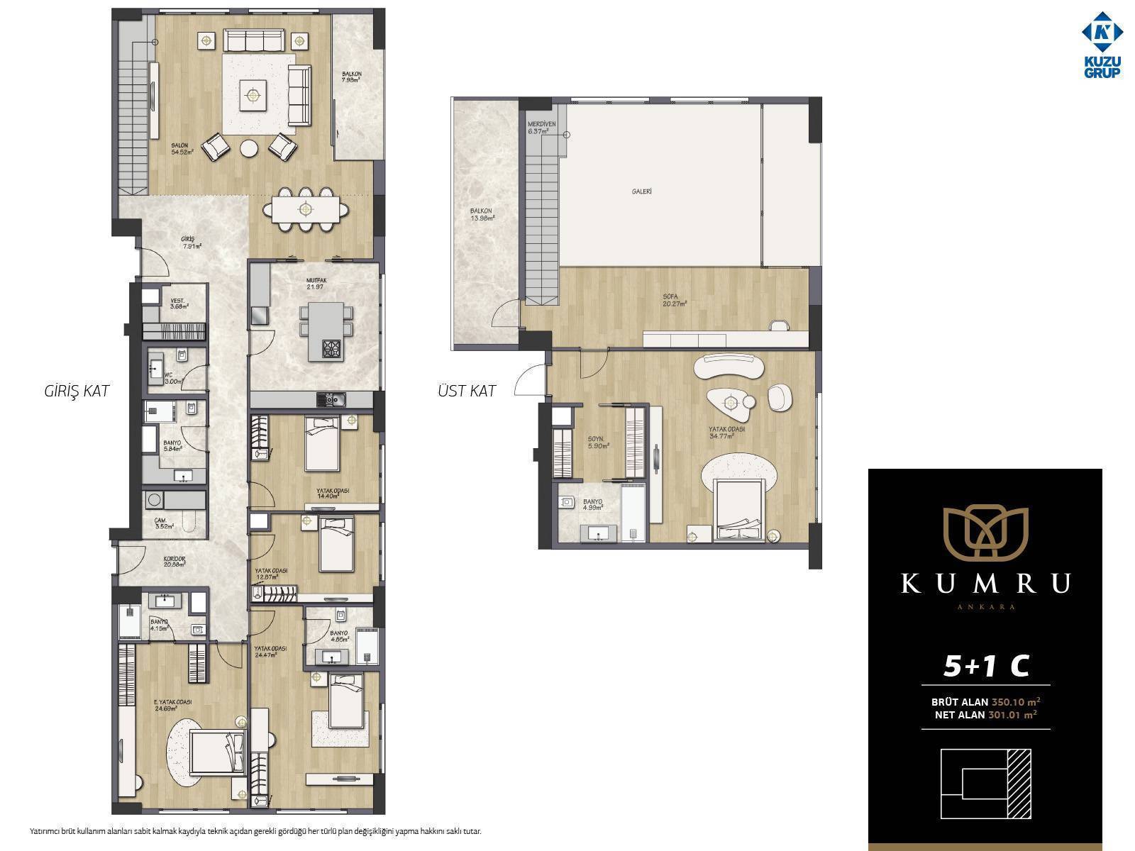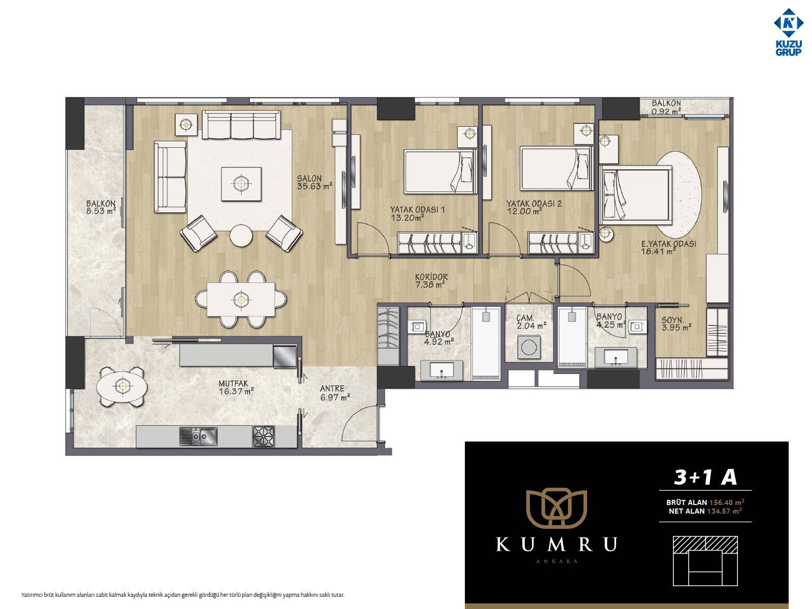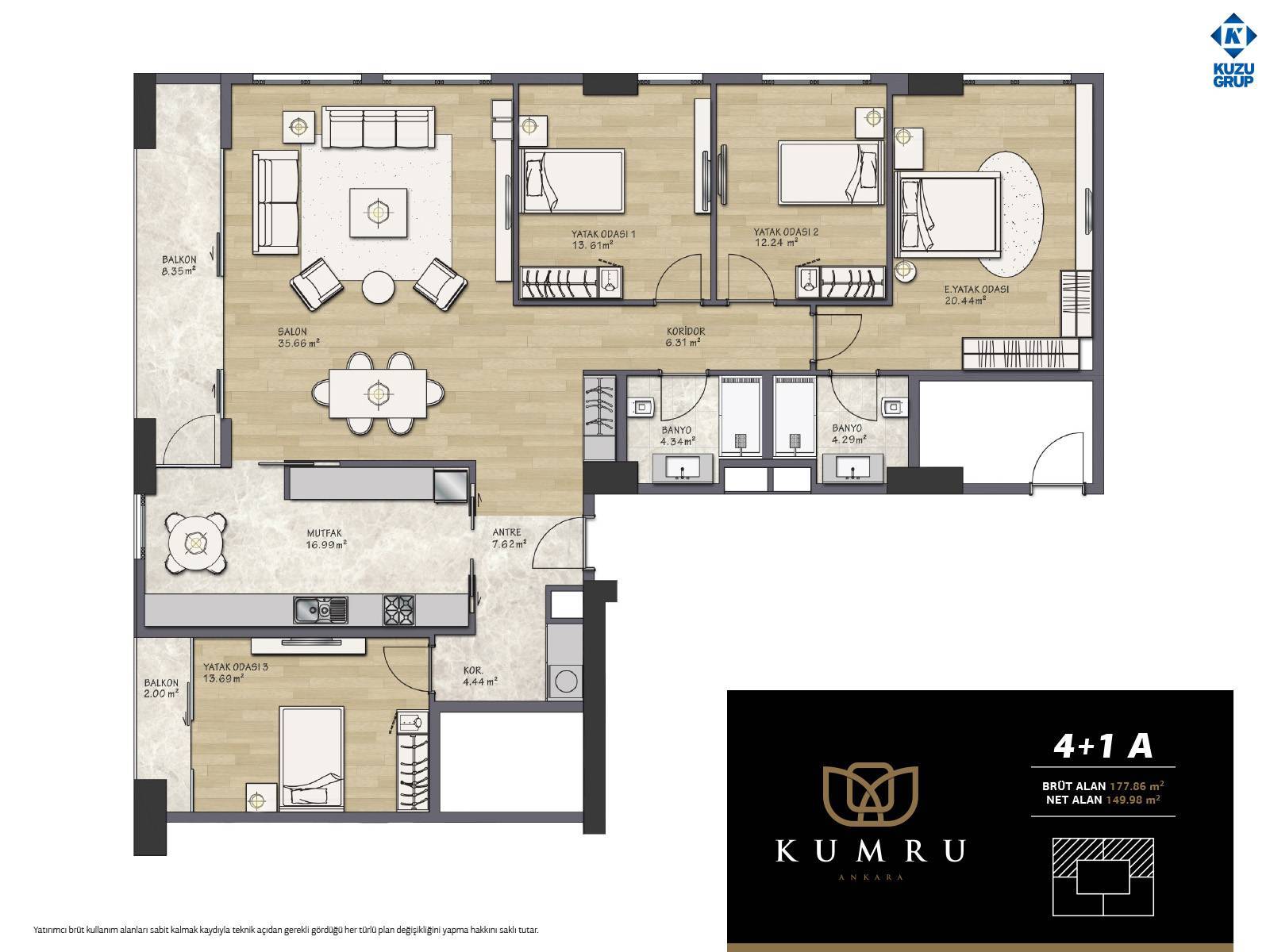 Kumru Ankara'da 1+1 daireler 66.11 ile 82.47 metrekare arasında, 2+1 daireler 92.75 ile 122.06 metrekare arasında, 3+1 daireler 145.62 ile 156.64 metrekare arasında, 4+1 daireler 177.44 ile 223.27 metrekare arasında ve 5+1 daireler 297.10 metrekare büyüklüklere sahip.