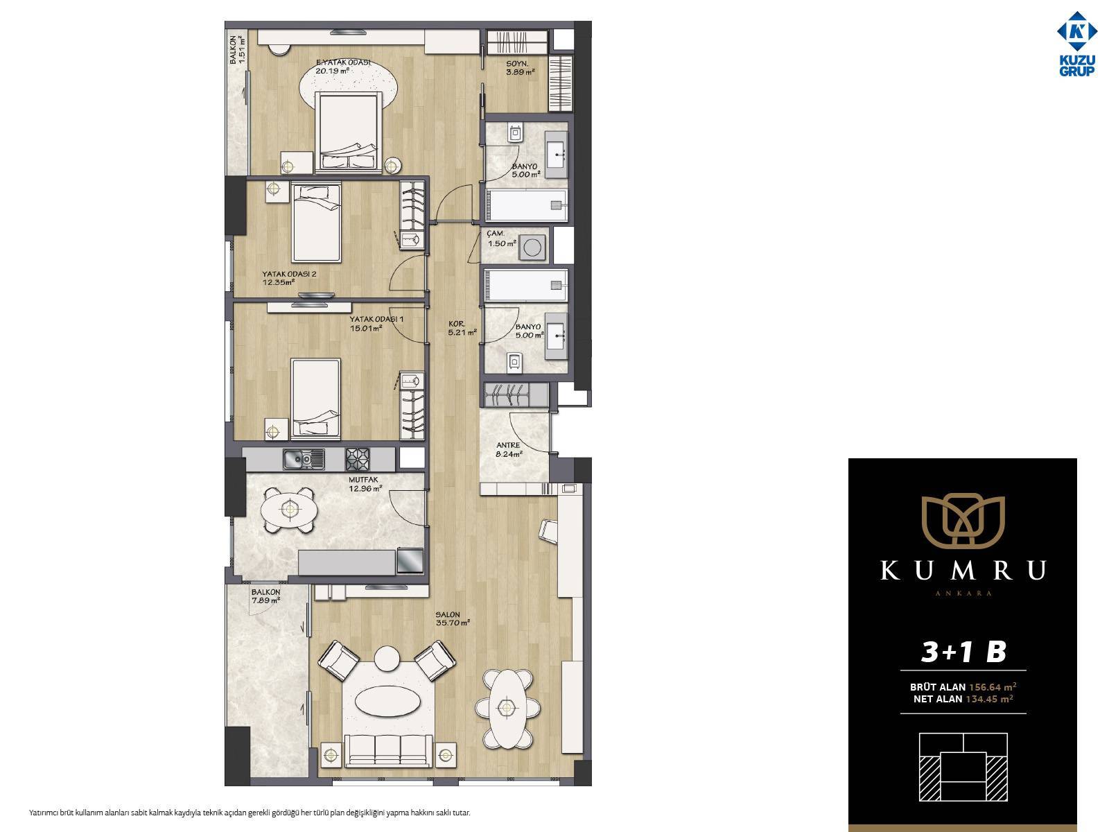 Kumru Ankara projesi 1 oda 1 salon, 1,5 oda 1 salon, 2 oda 1 salon, 3 oda 1 salon, 4 oda 1 salon ve 5 oda 1 salon tiplerinde dizayn edildi. Projede 1+1, 1,5+1 ve 2+1 daireler için ayrı, 3+1, 4+1 ve 5+1 daireler için ayrı giriş lobileri tasarlandı.