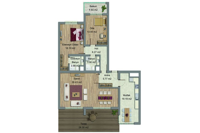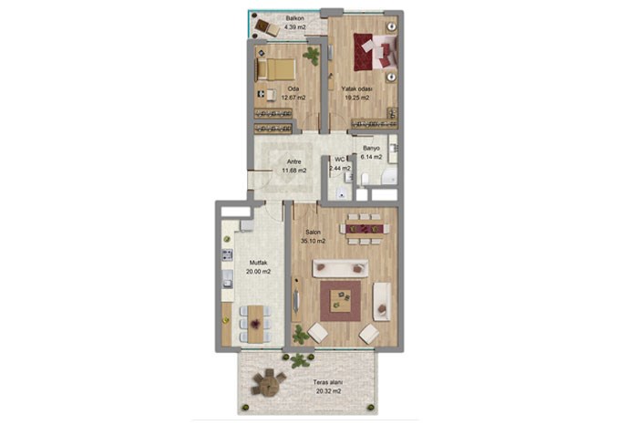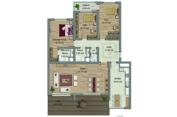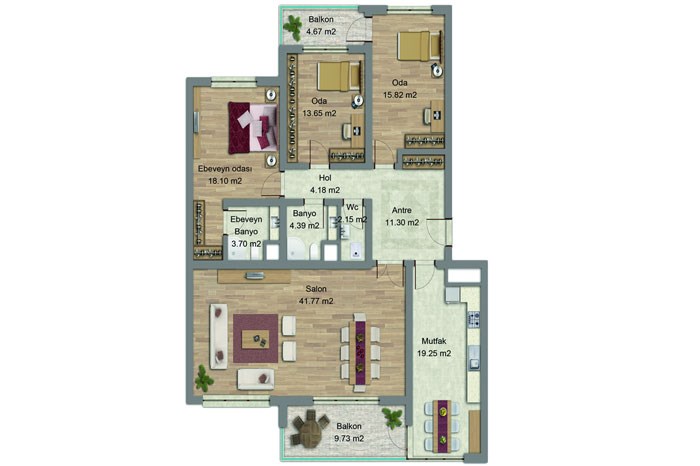 - Projede 3+1 daireler net 148 metrekare, 4+1 daireler net 164 metrekare, 6+1 daireler net 243 metrekare olarak tasarlandı.