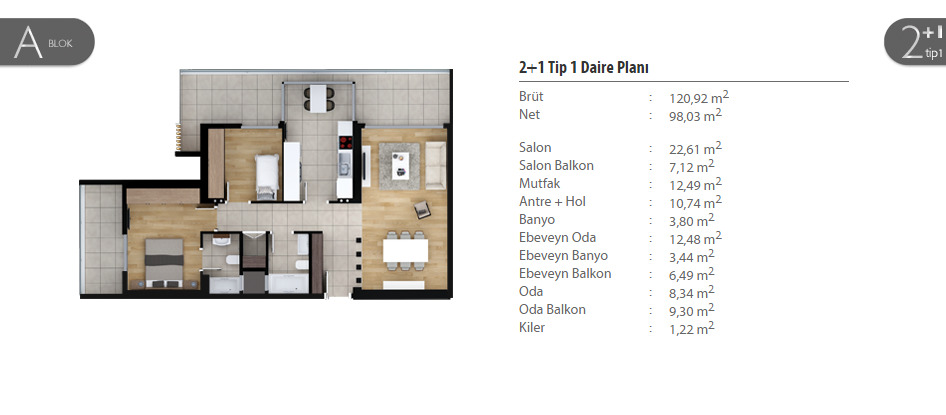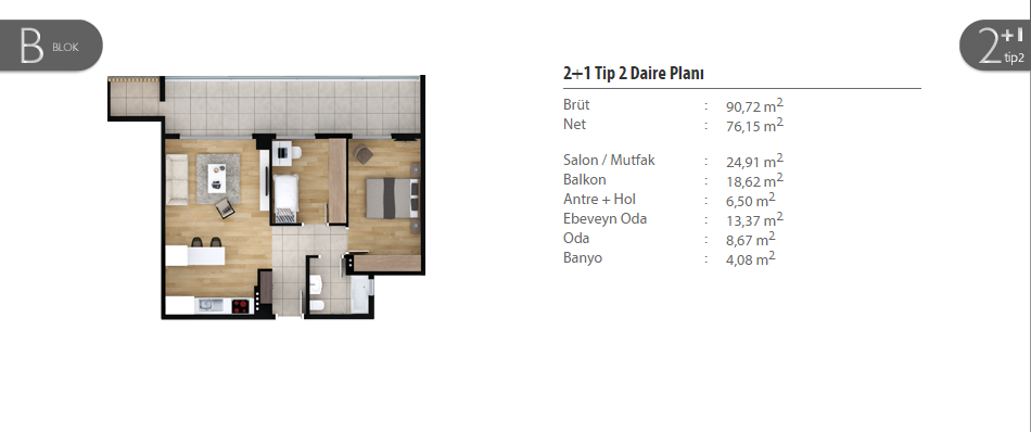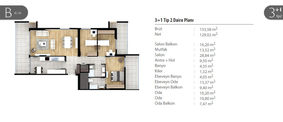 Mavişehir Modern 4 projesinde 1+1 daireler brüt 64,04 net 54,17 metrekare, 2+1 daireler brüt 120,92 ve 90,72 metrekare, net 98,03 ve 76,15 metrekare, 3+1 daireler brüt 171,08 ve 153,58 metrekare, net 153,58 ve 129,02 metrekare büyüklüklere sahip.