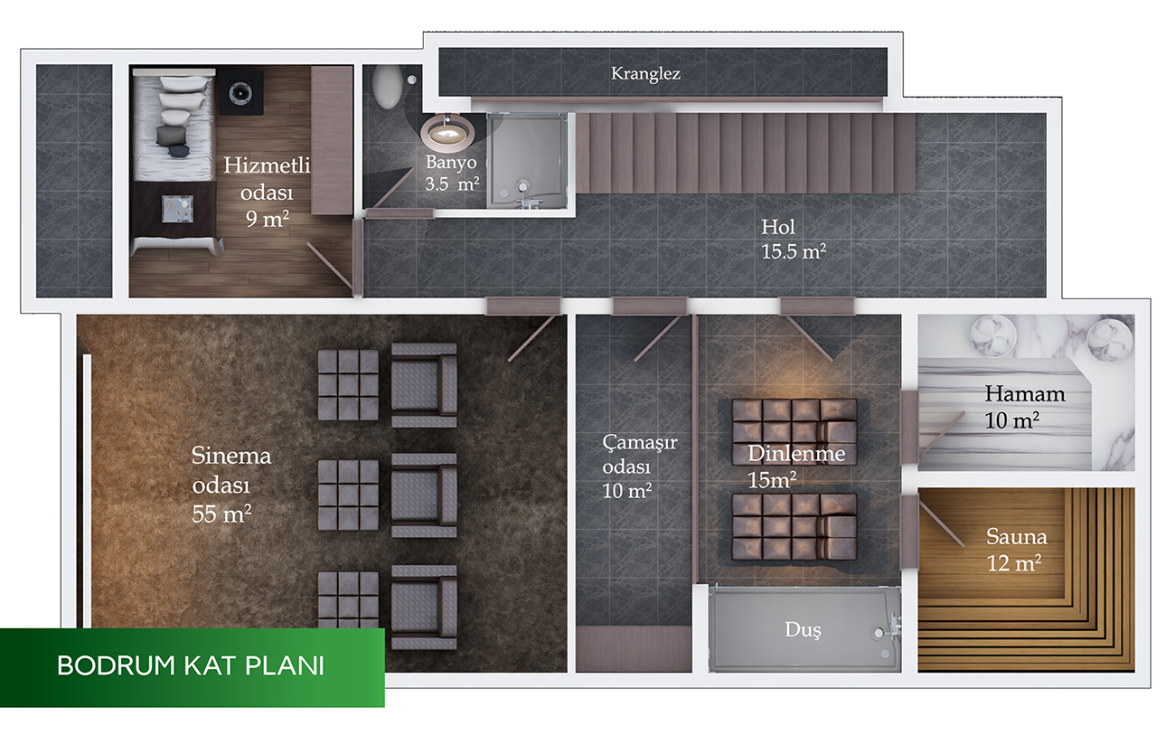 Myrina Evleri projesinde her villanın kendine özel yüzme havuzu, güneşlenme terası, saunası, hamamı, sinema odası, dinlenme odası bulunuyor. Projede her villarının 106 metrekare terası mevcut.
