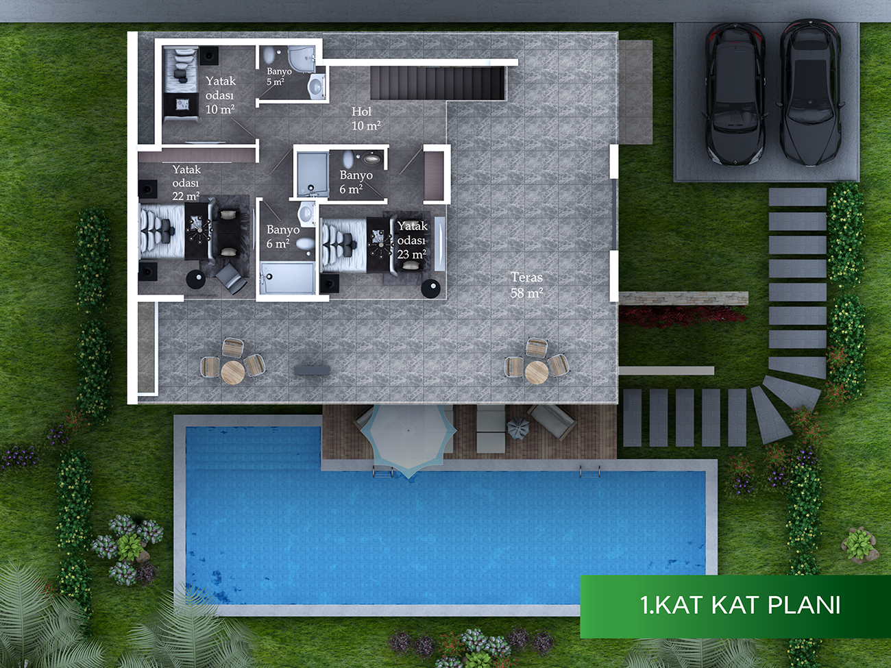 3 katlı olarak inşa edilen Myrina Evleri projesinde villalar 400 metrekare büyüklüğünde 4 oda 1 salon şeklinde dizayn edildi.