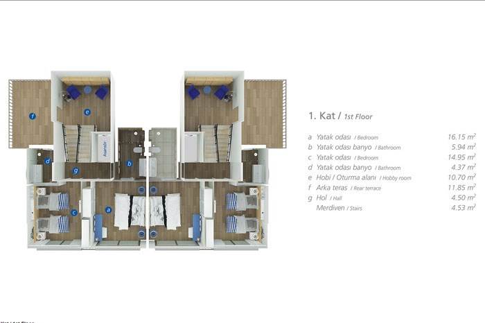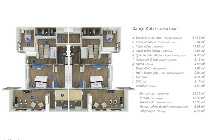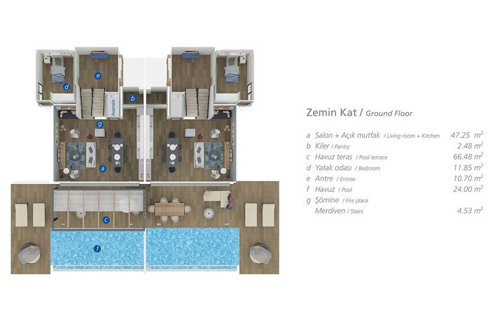- Villaların bahçe katında odaların yanı sıra zen bahçesi, iç teras; zemin katında ise havuz teras, şömine yer alıyor. Teras katında ise geniş teras ve mutfak mevcut durumda.