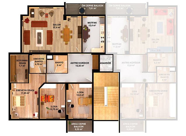Orange City projesinde 2 oda 1 salon daireler 118 ve 133 metrekare, 3 oda 1 salon daireler 148 ila 184 metrekare, 4 oda 1 salon dubleksler 238 ila 321 metrekare arasında büyüklüklerle dizayn edildi.