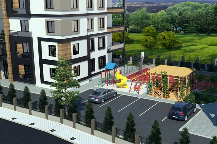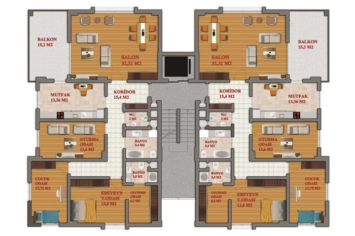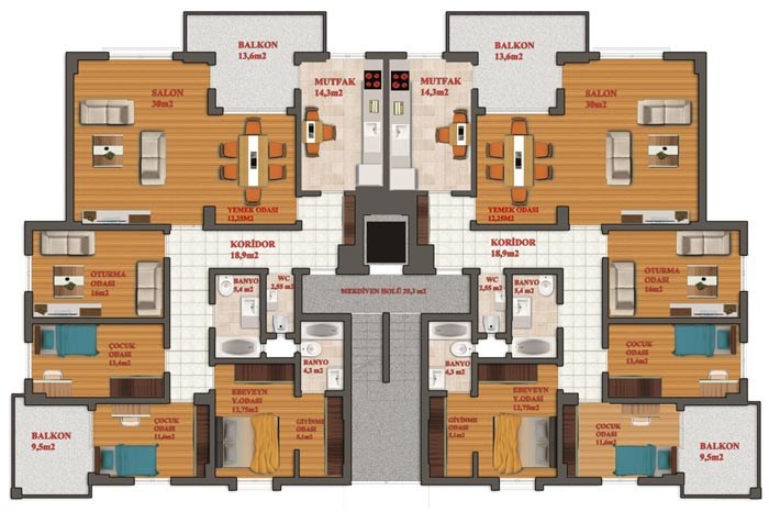 - Projedeki 12 adet 3 oda 1 salon daire brüt 170, net 133 metrekare, 24 adet 4 oda 1 salon daire ise brüt 206, net 169 metrekare olarak dizayn edildi.