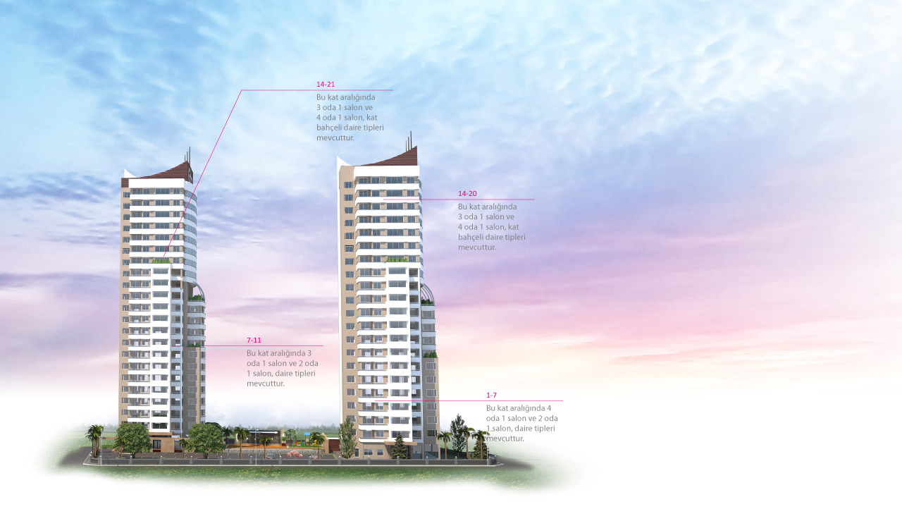 2 adet 11 katlı, 2 adet 14 katlı toplam 4 blokta 248 konuttan meydana gelen projede 2+1, 3+1 ve 4+1 şeklinde farklı konut seçenekleri bulunmakta,