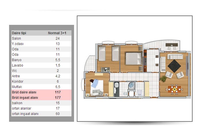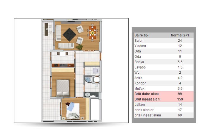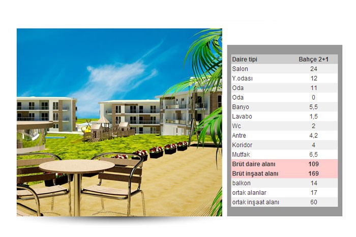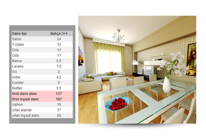 - 49.976 metrekare arazi üzerine kurulan proje 99 ile 109 metrekare 2+1 ve 117 ile 127 metrekare arasında değişen 3+1 daire seçenekleri mevcut