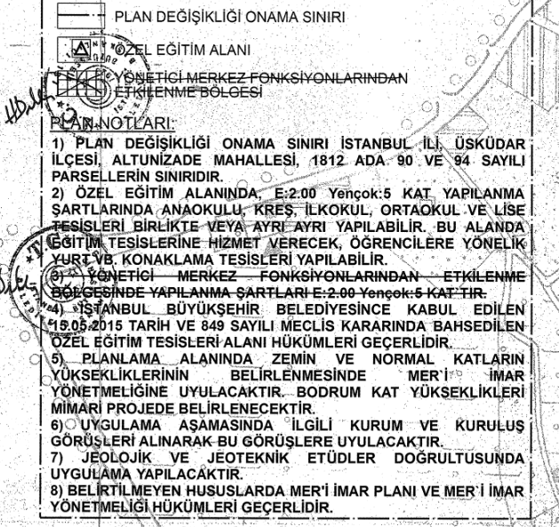 Üsküdar Altunizade Mahallesi 1812 ada 90 parsel (Altunizade Erker Öğrenci Yurdu) ve 94 parsellere (Özel Asfa Eğitim Kurumları) ilişkin 1/50000 ölçekli 17 Haziran 2016 tasdik tarihli plan tadilatı askıya çıktı.