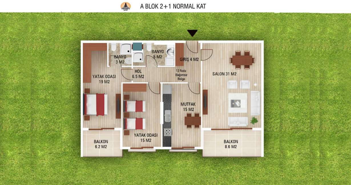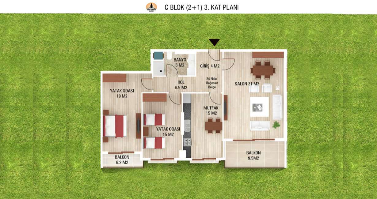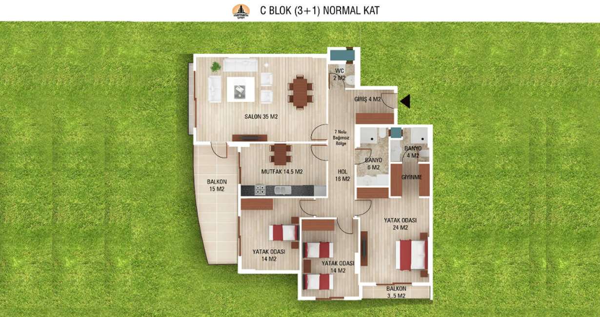Yeşill Residence projesinde 2 oda 1 salon, 3 oda 1 salon ve 4 oda 1 salon daire seçenekleri bulunuyor. Projedeki 2+1 daireler brüt 84, 98 ve 126 metrekare net 74, 88 ve 111 metrekare, 3+1 daireler brüt 133, 144 ve 162 metrekare net 118, 128 ve 146 metrekare, 4+1 daireler ise brüt 191 net 167 metrekare alanlarla dizayn edildi.
