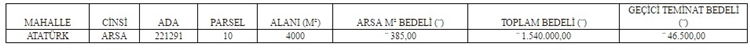 Ankara Kahramankazan Belediye Başkanlığı, mülkiyetinde bulunan 1 adet arsayı satışa çıkartıyor...Kahramankazan Belediye Başkanlığı, Atatürk mahallesinde yer alan 4 bin metrekarelik arsayı açık arttırma usulüyle satışa çıkartıyor.