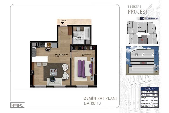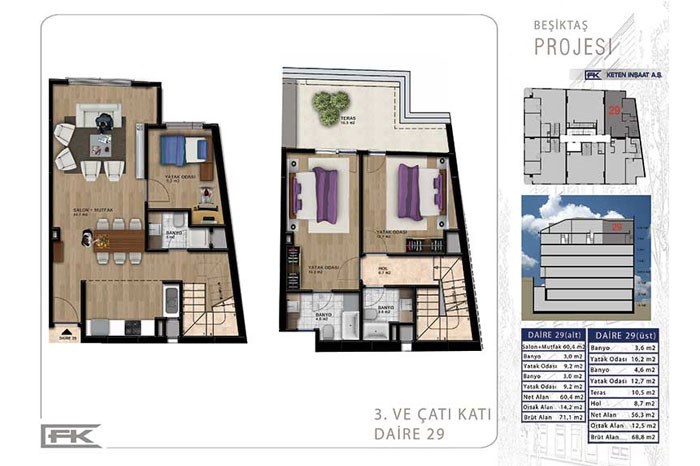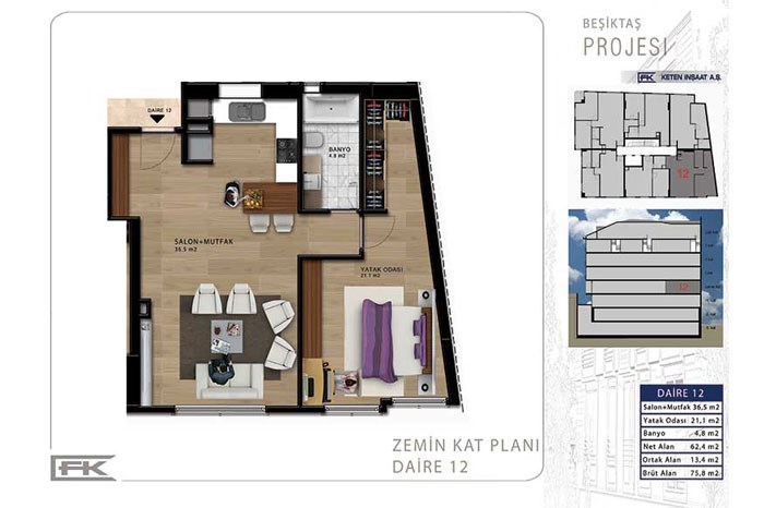 7 katlı tek blok halinde yükselen Keten Çırağan projesi toplam 32 adet konuttan meydana geliyor. Teslimlerin hemen gerçekleştiği projede 20 adet 1+1,8 adet 2+1 ve 4 adet 3+1 daire tipi yer alıyor.