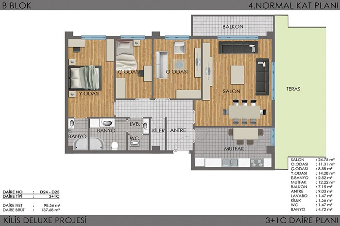 - Yüzde 75'i yeşil alana ayrılmış olan Kilis Deluxe projesi 4 bloktan meydana geliyor.