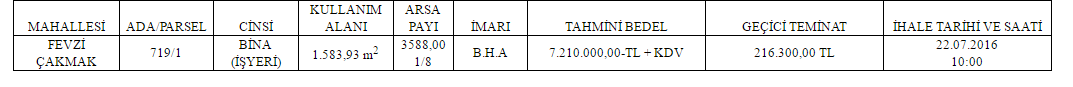 Kocaeli Darıca Belediye Başkanlığı, Fevzi Çakmak Mahallesi’nde konumlanan Adnan Menderes Kültür Merkezi'ndeki işyerini 22 Temmuz saat 10:00’da “kapalı teklif”usulü ile satışa çıkarıyor.
