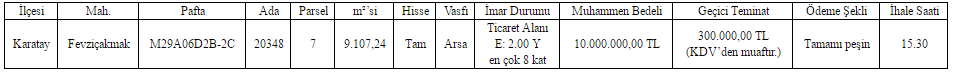 Konya Büyükşehir Belediyesi Karatay'da yer alan arsasını 10 milyon TL'ye satışa çıkarıyor...Konya Büyükşehir Belediyesi mülkiyeti kendisine ait olan Karatay Fevziçakmak mahallesindeki arsasını satışa çıkarıyor. 20348 ada 7 parselde kayıtlı olan arsa 9 bin 107 metrekare alana sahip.