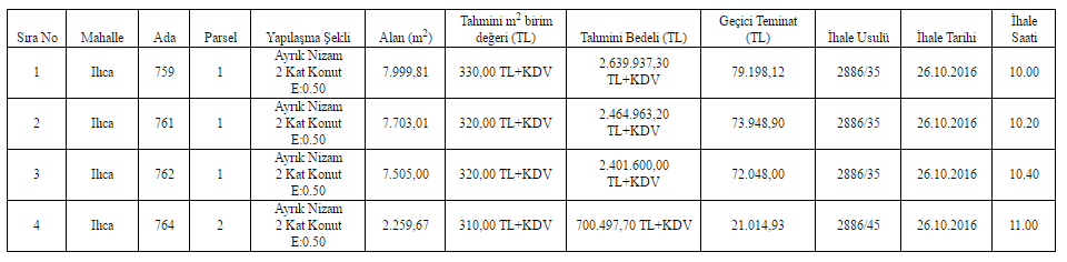 Satışa söz konusu arsaların toplam bedeli 8 milyon 206 bin 998 bin TL. Arsaların ihalesi 26 Ekim 2016 günü 10:00 ile 11:00 saatleri arasında 20 dakika arayla yapılacak.