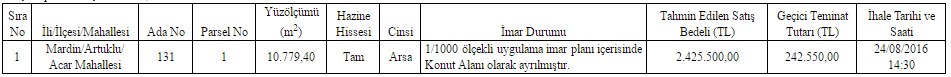 131 ada 1 parselde kayıtlı olan arsanın tahmini satış bedeli 2 milyon 425 bin 500 TL olarak belirlendi. Arsanın ihalesi 24 Ağustos 2016 tarihinde saat 14:30'da Mardin Defterdarlığı Milli Emlak Müdürlüğü Makam Odası'nda yapılacak.