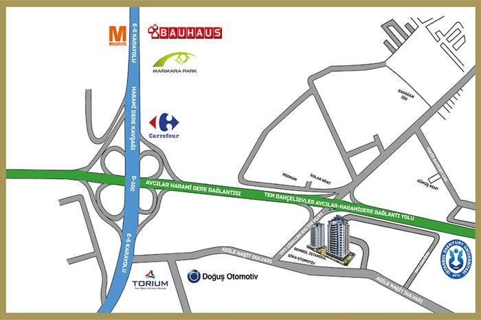 TEM'e bakan Mavera Ahsen projesi Migros'a 1, Carrefour'a ve E-5'e 3, Bauhaus, Marmarapark, Esenyurt Devlet Hastanesi ile Atatürk Havalimanı'na 4 ve Medilife Hastanesi'ne 5 dakika mesafede konumlanıyor.