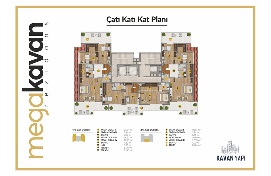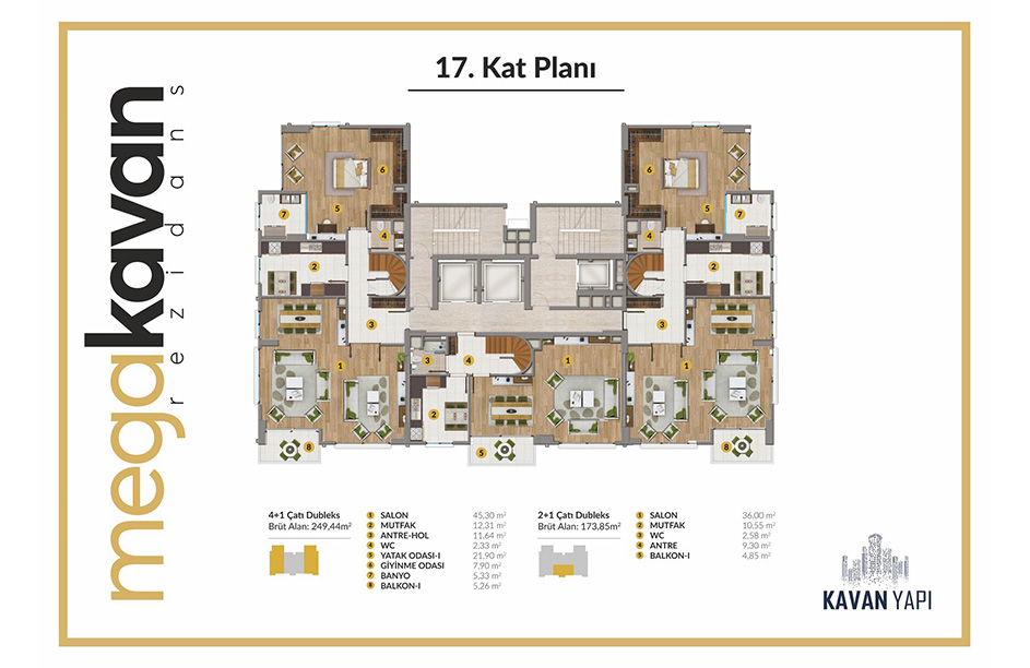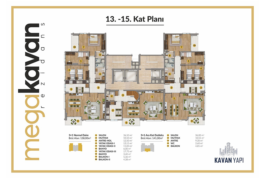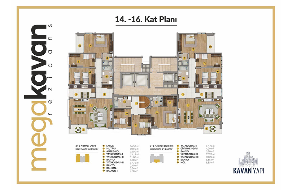 Mega Kavan Residences projesinde daireler 2+1 dubleks, 3+1 ve 4+1 olarak dizayn edilmiş. Dairelerin ölçüleri ise 138 metrekare ile 249 metrekare arasında değişiyor.