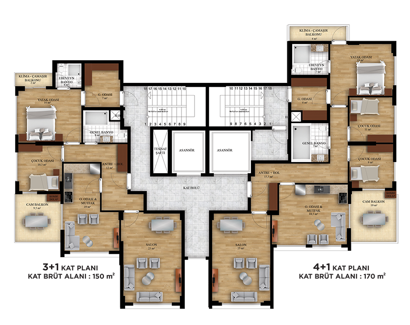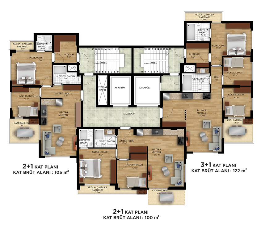 Metropol Towers projesinde 2+1 daireler 100 ila 105 metrekare, 3+1 daireler 122 ila 150 metrekare, 4+1 daireler ise 170 metrekare büyüklüklerle dizayn edildi.
