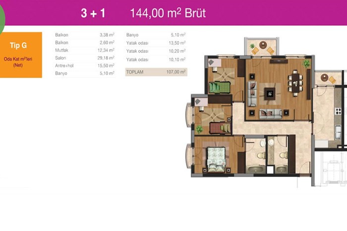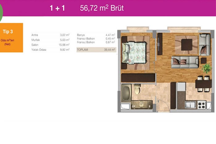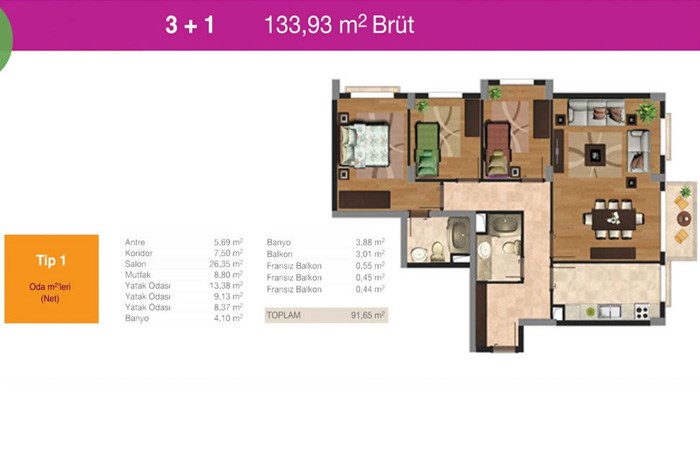 3 oda 1 salon daireler : 195 bin lira ile 235 bin lira arasında değişen ve