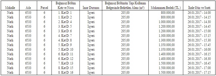 Narlıdere Belediyesi 14 adet işyerini 800 bin TL ile 1.5 milyon TL arasında değişen fiyatlarla ihaleye çıkarıyor...Narlıdere Belediyesi Narlı mahallesinde yer alan 14 işyerini satışa çıkarıyor. Satışa konu olan işyeri 6533 ada 6 parselde bulunuyor.