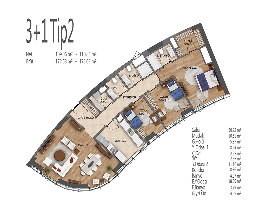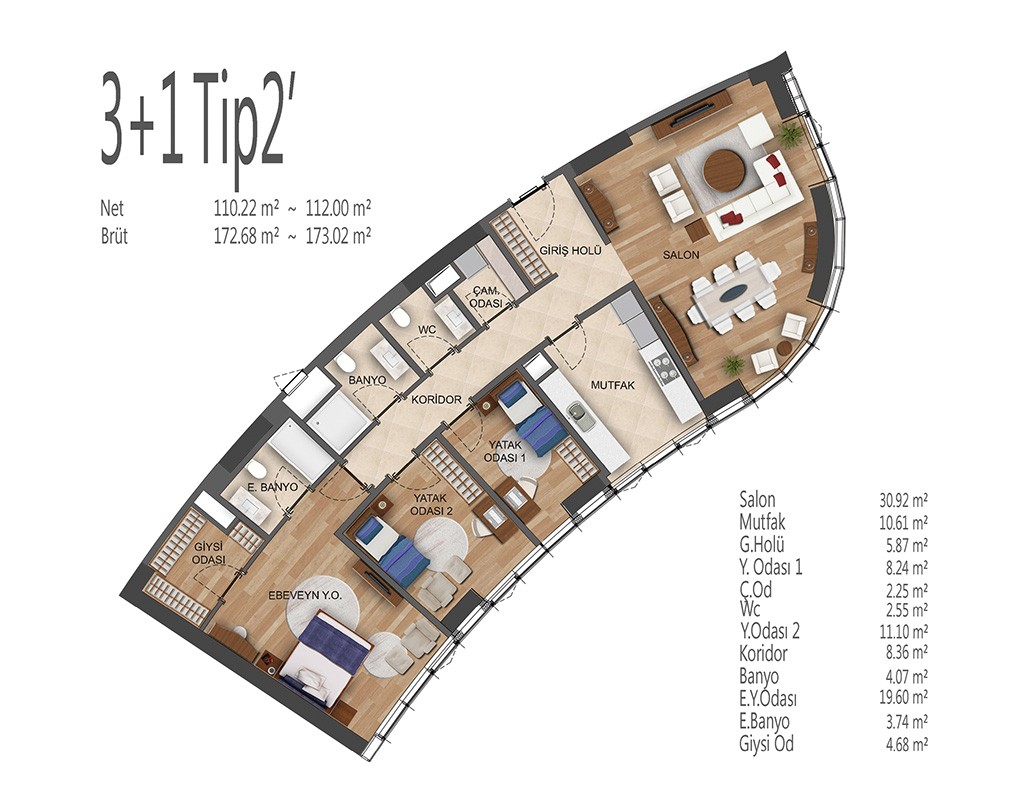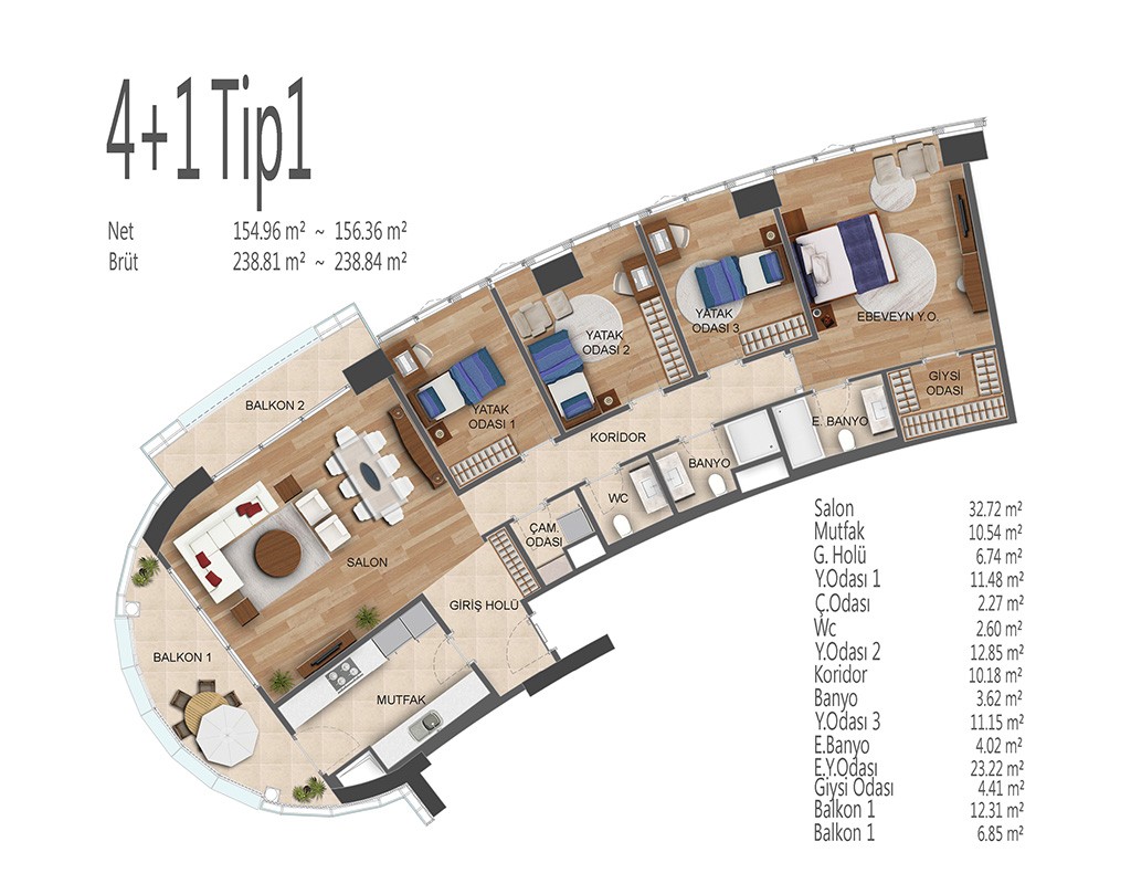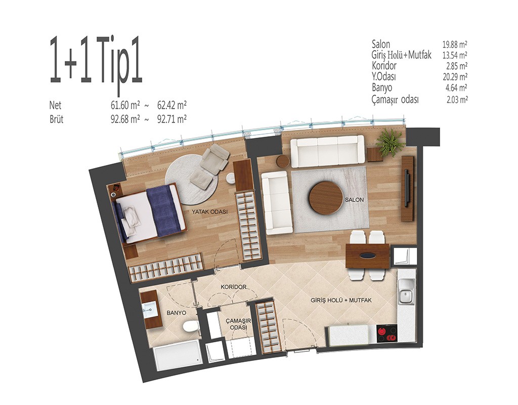 Oryapark İstanbul projesinde 1+1, 2+1, 3+1 ve 4+1 daire tiplerinde dizayn edildi. Projede 1+1 daireler brüt 82-92, net 53-62 metrekare, 2+1 daireler brüt 156-138, net 91-100 metrekare, 3+1 daireler brüt 172-196, net 109-128 metrekare, 4+1 daireler brüt 238, net 154 metrekare büyüklüklerde dizayn edildi.