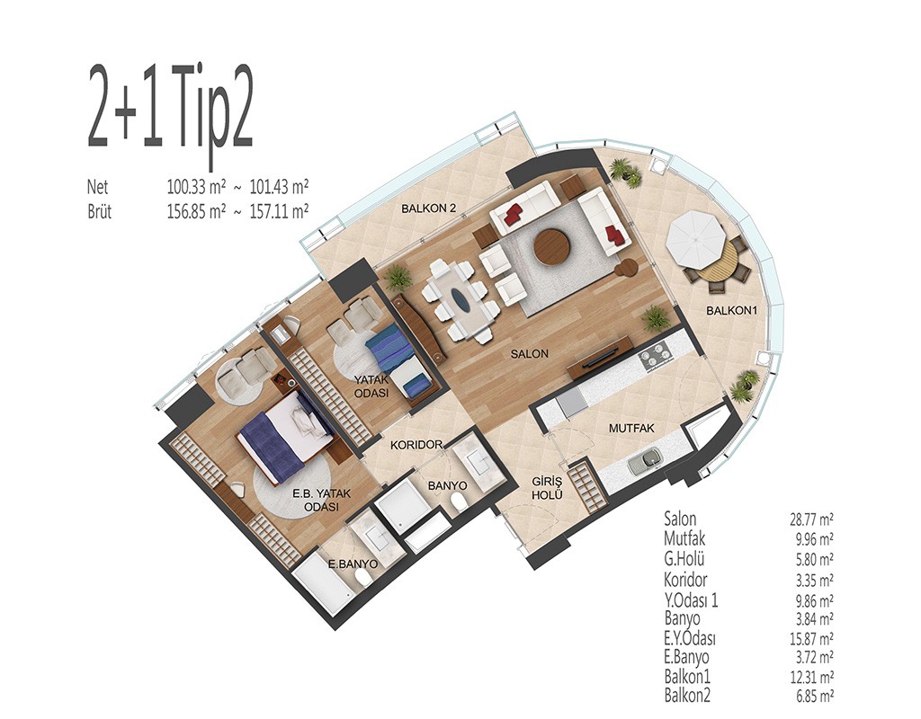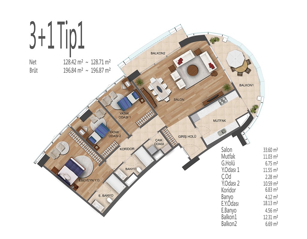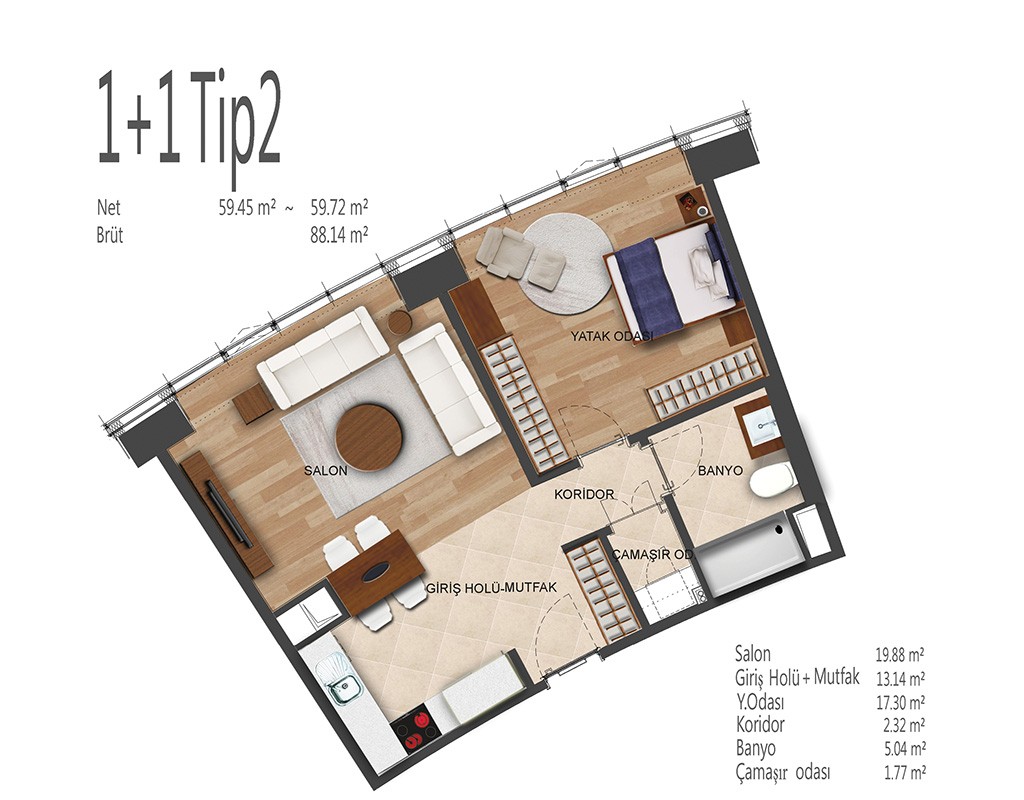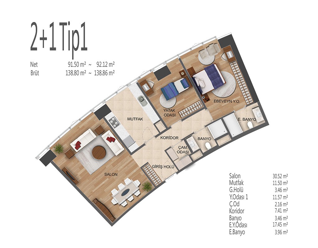 Oryapark İstanbul projesinde 1+1, 2+1, 3+1 ve 4+1 daire tiplerinde dizayn edildi. Projede 1+1 daireler brüt 82-92, net 53-62 metrekare, 2+1 daireler brüt 156-138, net 91-100 metrekare, 3+1 daireler brüt 172-196, net 109-128 metrekare, 4+1 daireler brüt 238, net 154 metrekare büyüklüklerde dizayn edildi.