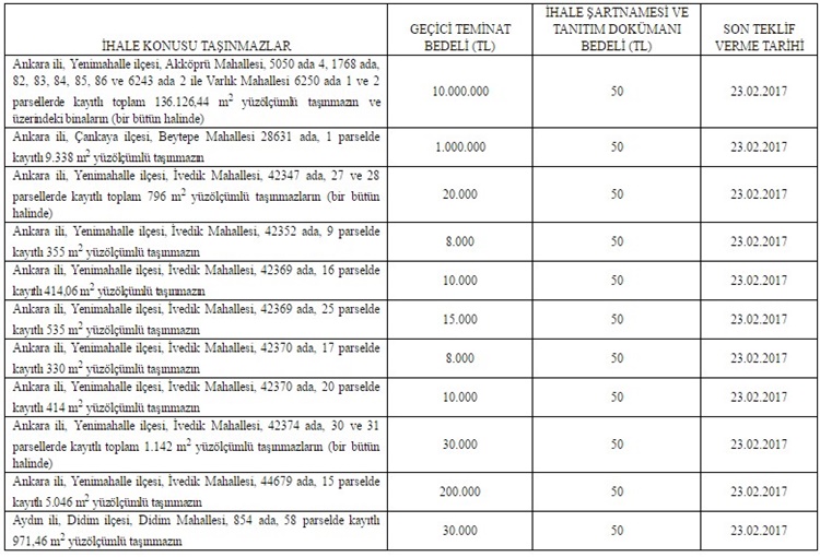 İhaleye katılmak isteyenlerin 23 Şubat 2017 tarihine kadar teklif vermeleri gerekiyor. İhaleler pazarlık usulüyle gerçekleştirilecek olup, İhale Komisyonunca gerekli görüldüğü takdirde ihaleler, pazarlık görüşmesine devam edilen teklif sahiplerinin katılımı ile açık artırma suretiyle sonuçlandırılabilecek.