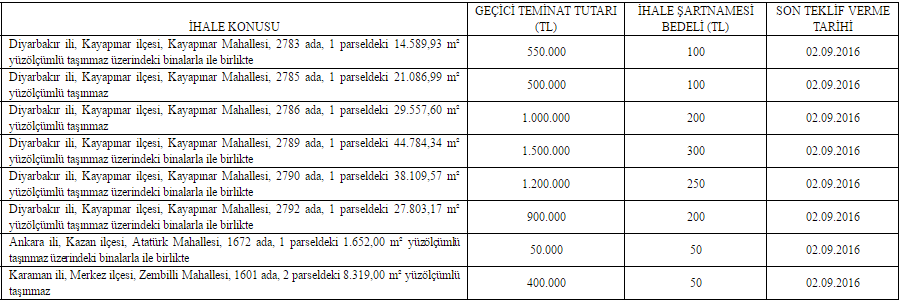 Diyarbakır'da 6 adet, Ankara'da 1 adet arsa üzerindeki binalarla, Karaman'daki 1 arsa satışa sunuluyor. Gayrimenkullerin detayları aşağıdaki tabloda yer alıyor.