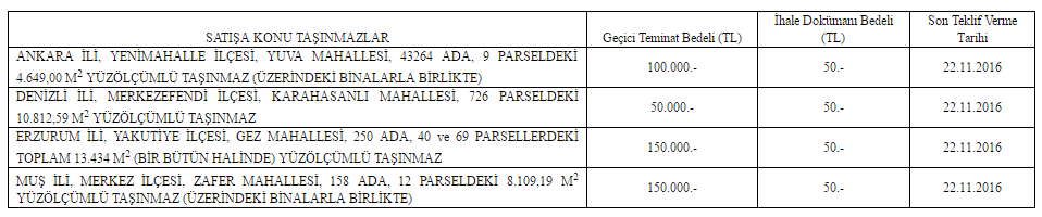 Başbakanlık Özelleştirme İdaresi Başkanlığı 4 ilde yer alan 4 gayrimenkulünü satış yöntemiyle özelleştiriyor...Başabakanlık Özelleştirme İdaresi Ankara, Denizli, Erzurum ve Muş'ta yer alan 4 gayrimenkulü satışa çıkarıyor. Satışa söz konusu gayrimenkullerin toplam geçici teminatı 450 bin TL olarak belirlendi.
