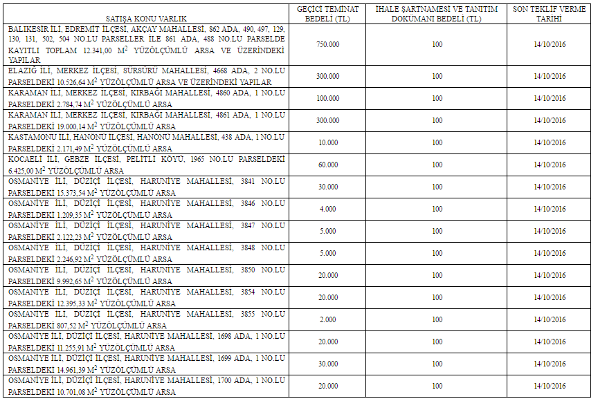 Başbakanlık Özelleştirme İdaresi 6 ilde yer alan 16 arsayı satış yöntemiyle özelleştiriyor...Başbakanlık Özelleştirme İdaresi Balıkesir, Elazığ, Karaman, Kastamonu, Kocaeli ve Osmaniye'de yer alan 16 adet arsayı satışa çıkarıyor. Satışa söz konusu arsalar için 14 Ekim 2016 tarihine kadar teklif verilebiliyor.