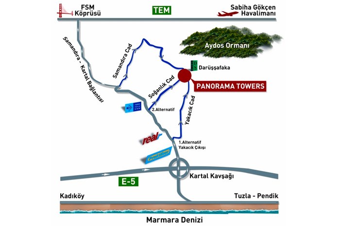- E-5'e 3.7 kilometre mesafede bulunan Panorama Towers projesinin sahile uzaklığı ise 5.6 kilometre.