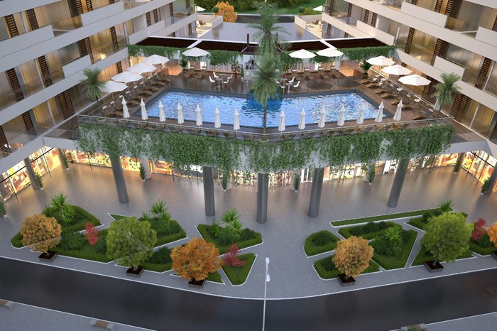 Seba Flats projesinde dairelerin teras ve bahçeleri bulunuyor.